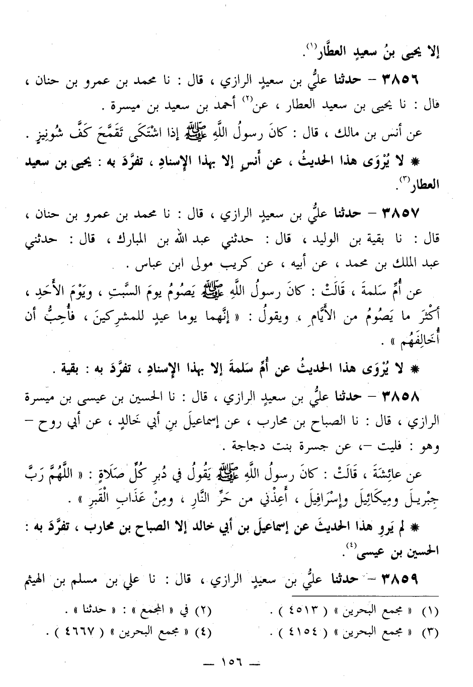 3857 - حَدَّثَنَا عَلِيُّ بْنُ سَعِيدٍ الرَّازِيُّ قَالَ: نا مُحَمَّدُ بْنُ عَمْرِو بْنِ حَنَانَ قَالَ: نا بَقِيَّةُ بْنُ الْوَلِيدِ قَالَ: حَدَّثَنِي عَبْدُ اللَّهِ بْنُ الْمُبَارَكِ قَالَ: حَدَّثَنِي عَبْدُ الْمَلِكِ بْنِ مُحَمَّدٍ، عَنْ أَبِيهِ، عَنْ كُرَيْبٍ مَوْلَى ابْنِ عَبَّاسٍ، عَنْ أُمِّ سَلَمَةَ، قَالَتْ: كَانَ رَسُولُ اللَّهِ صَلَّى اللهُ عَلَيْهِ وَسَلَّمَ §يَصُومُ يَوْمَ السَّبْتِ، وَيَوْمَ الْأَحَدِ، أَكْثَرَ مَا يَصُومُ مِنَ الْأَيَّامِ، وَيَقُولُ: «إِنَّهُمَا يَوْمَا عِيدٍ لِلْمُشْرِكِينَ، فَأُحِبُّ أَنْ أُخَالِفَهُمْ»