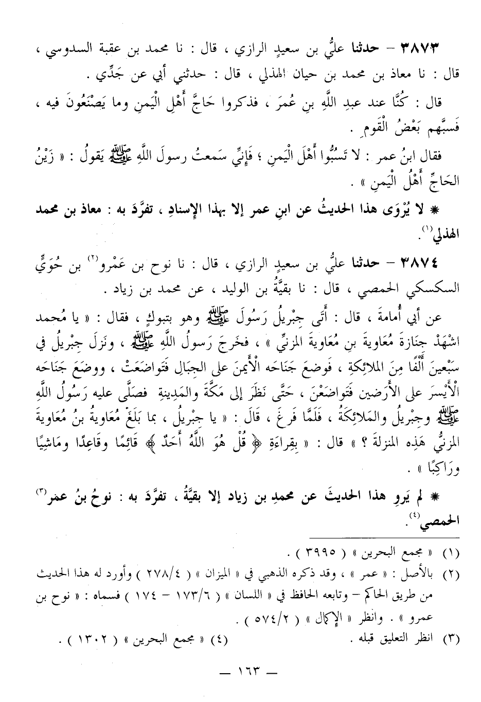 3874 - حَدَّثَنَا عَلِيُّ بْنُ سَعِيدٍ الرَّازِيُّ قَالَ: نا نُوحُ بْنُ عَمْرِو بْنِ حُوَيٍّ السَّكْسَكِيُّ الْحِمْصِيُّ قَالَ: نا بَقِيَّةُ بْنُ الْوَلِيدِ، عَنْ مُحَمَّدِ بْنِ زِيَادٍ، عَنْ أَبِي أُمَامَةَ قَالَ: أَتَى جِبْرِيلُ رَسُولَ اللَّهِ صَلَّى اللهُ عَلَيْهِ وَسَلَّمَ وَهُوَ بِتَبُوكَ، فَقَالَ «يَا مُحَمَّدُ، اشْهَدْ جَنَازَةَ مُعَاوِيَةَ بْنِ مُعَاوِيَةَ الْمُزَنِيِّ، فَخَرَجَ رَسُولُ اللَّهِ صَلَّى اللهُ عَلَيْهِ وَسَلَّمَ، وَنَزَلَ جِبْرِيلُ فِي سَبْعِينَ أَلْفًا مِنَ الْمَلَائِكَةِ، فَوَضَعَ جَنَاحَهُ الْأَيْمَنَ عَلَى الْجِبَالِ فَتَوَاضَعْتُ، وَوَضَعَ جَنَاحَهُ الْأَيْسَرَ عَلَى الْأَرَضِينَ فَتَوَاضَعْنَ، حَتَّى نَظَرَ إِلَى مَكَّةَ وَالْمَدِينَةِ فَصَلَّى عَلَيْهِ رَسُولُ اللَّهِ صَلَّى اللهُ عَلَيْهِ وَسَلَّمَ وَجِبْرِيلُ وَالْمَلَائِكَةُ، فَلَمَّا فَرَغَ قَالَ: يَا جِبْرِيلُ، §بِمَا بَلَغَ مُعَاوِيَةُ بْنُ مُعَاوِيَةَ الْمُزَنِيُّ هَذِهِ الْمَنْزِلَةَ؟ قَالَ: بِقِرَاءَةِ قُلْ هُوَ اللَّهُ أَحَدٌ قَائِمًا وَقَاعِدًا وَمَاشِيًا وَرَاكِبًا»