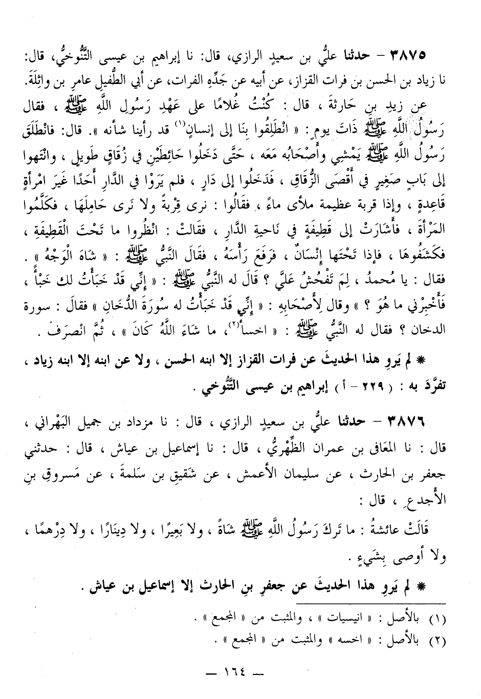 3875 - حَدَّثَنَا عَلِيُّ بْنُ سَعِيدٍ الرَّازِيُّ قَالَ: نا إِبْرَاهِيمُ بْنُ عِيسَى التَّنُوخِيُّ قَالَ: نا زِيَادُ بْنُ الْحَسَنِ بْنِ فُرَاتٍ الْقَزَّازُ، عَنْ أَبِيهِ، عَنْ جَدِّهِ الْفُرَاتِ، عَنْ أَبِي الطُّفَيْلِ عَامِرِ بْنِ وَاثِلَةَ، عَنْ زَيْدِ بْنِ حَارِثَةَ قَالَ: كُنْتُ غُلَامًا عَلَى عَهْدِ رَسُولِ اللَّهِ صَلَّى اللهُ عَلَيْهِ وَسَلَّمَ، فَقَالَ رَسُولُ اللَّهِ صَلَّى اللهُ عَلَيْهِ وَسَلَّمَ ذَاتَ يَوْمٍ: «§انْطَلِقُوا بِنَا إِلَى إِنْسَانٍ قَدْ رَأَيْنَا شَأْنَهُ» قَالَ: فَانْطَلَقَ رَسُولُ اللَّهِ صَلَّى اللهُ عَلَيْهِ وَسَلَّمَ، يَمْشِي وَأَصْحَابُهُ مَعَهُ، حَتَّى دَخَلُوا حَائِطَيْنِ فِي زُقَاقٍ طَوِيلٍ، وَانْتَهَوْا إِلَى بَابٍ صَغِيرٍ، فِي أَقْصَى الزُّقَاقِ، فَدَخَلُوا إِلَى دَارٍ، فَلَمْ يَرَوْا فِي الدَّارِ أَحَدًا غَيْرَ امْرَأَةٍ قَاعِدَةٍ، وَإِذَا قِرْبَةٌ عَظِيمَةٌ مَلْأَى مَاءً، فَقَالُوا: نَرَى قِرْبَةً وَلَا نَرَى حَامِلَهَا، فَكَلَّمُوا الْمَرْأَةَ، فَأَشَارَتْ إِلَى قَطِيفَةٍ فِي نَاحِيَةِ الدَّارِ، فَقَالَتْ: انْظُرُوا مَا تَحْتَ الْقَطِيفَةِ فَكَشَفُوهَا، فَإِذَا تَحْتَهَا إِنْسَانٌ، فَرَفَعَ رَأْسَهُ فَقَالَ النَّبِيُّ صَلَّى اللهُ عَلَيْهِ وَسَلَّمَ: «شَاهَ الْوَجْهُ» فَقَالَ: يَا مُحَمَّدُ، لِمَ تَفْحَشُ عَلَيَّ؟ قَالَ لَهُ النَّبِيُّ صَلَّى اللهُ عَلَيْهِ وَسَلَّمَ: «إِنِّي قَدْ خَبَأْتُ لَكَ خَبْأً، فَأَخْبِرْنِي مَا هُوَ» وَقَالَ لِأَصْحَابِهِ: «إِنِّي قَدْ خَبَّأْتُ لَهُ سُورَةَ الدُّخَانِ» فَقَالَ: سُورَةُ الدُّخَانِ؟ فَقَالَ لَهُ النَّبِيُّ صَلَّى اللهُ عَلَيْهِ وَسَلَّمَ: «اخْسَأْ، مَا شَاءَ اللَّهُ كَانَ، ثُمَّ انْصَرَفَ»