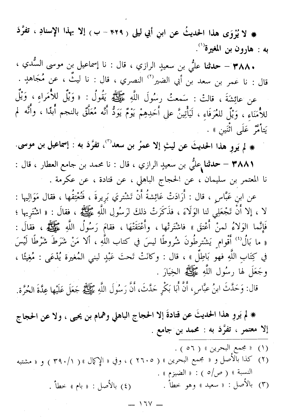 3881 - حَدَّثَنَا عَلِيُّ بْنُ سَعِيدٍ الرَّازِيُّ قَالَ: نا مُحَمَّدُ بْنُ جَامِعٍ الْعَطَّارُ قَالَ: نا الْمُعْتَمِرُ بْنُ سُلَيْمَانَ، عَنِ الْحَجَّاجِ الْبَاهِلِيِّ، عَنْ قَتَادَةَ، عَنْ عِكْرِمَةَ، عَنِ ابْنِ عَبَّاسٍ قَالَ: أَرَادَتْ عَائِشَةُ أَنْ تَشْتَرِيَ بَرِيرَةَ، فَتُعْتِقَهَا، فَقَالَ مَوَالِيهَا: لَا، إِلَّا أَنْ تَجْعَلِي لَنَا الْوَلَاءَ، فَذَكَرَتْ ذَلِكَ لِرَسُولِ اللَّهِ صَلَّى اللهُ عَلَيْهِ وَسَلَّمَ فَقَالَ: «اشْتَرِيهَا، §فَإِنَّمَا الْوَلَاءُ لِمَنْ أَعْتَقَ» فَاشْتَرَتْهَا، وَأَعْتَقَتْهَا، فَقَامَ رَسُولُ اللَّهِ صَلَّى اللهُ عَلَيْهِ وَسَلَّمَ فَقَالَ: «مَا بَالُ أَقْوَامٍ يَشْتَرِطُونَ شُرُوطًا لَيْسَ فِي كِتَابِ اللَّهِ، أَلَا مَنْ شَرَطَ شَرْطًا لَيْسَ فِي كِتَابِ اللَّهِ فَهُوَ بَاطِلٌ» قَالَ: وَكَانَتْ تَحْتَ عَبْدٍ لِبَنِي الْمُغِيرَةِ يُدْعَى: مُغِيثًا، وَجَعَلَ لَهَا رَسُولُ اللَّهِ صَلَّى اللهُ عَلَيْهِ وَسَلَّمَ الْخِيَارَ قَالَ: وَحَدَّثَ ابْنُ عَبَّاسٍ، أَنَّ أَبَا بَكْرٍ حَدَّثَ: «أَنَّ رَسُولَ اللَّهِ صَلَّى اللهُ عَلَيْهِ وَسَلَّمَ جَعَلَ عَلَيْهَا عِدَّةَ الْحُرَّةِ»