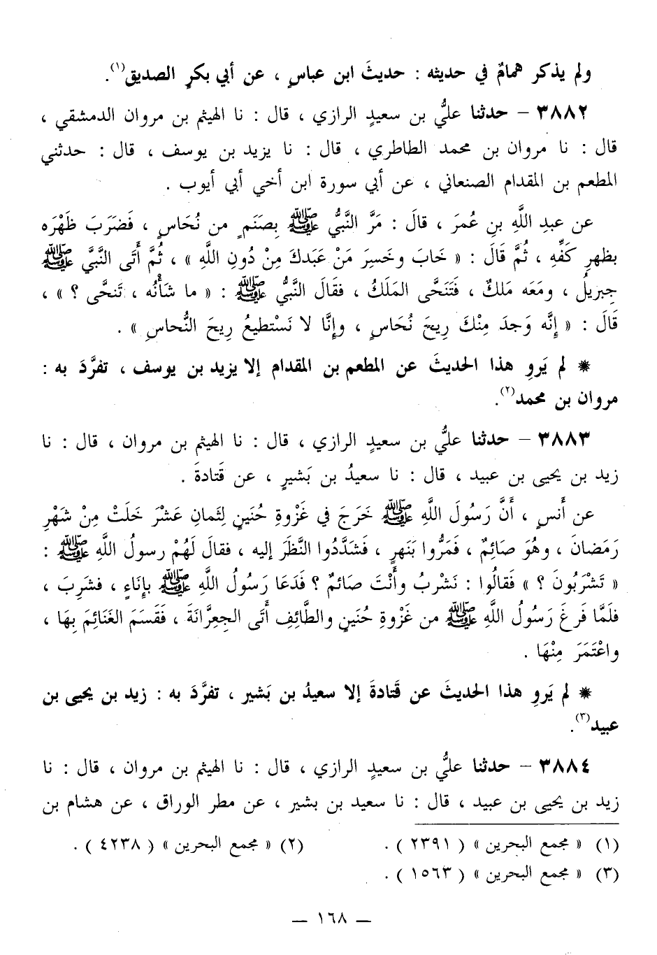 3882 - حَدَّثَنَا عَلِيُّ بْنُ سَعِيدٍ الرَّازِيُّ قَالَ: نا الْهَيْثَمُ بْنُ مَرْوَانَ الدِّمَشْقِيُّ قَالَ: نا مَرْوَانُ بْنُ مُحَمَّدٍ الطَّاطَرِيُّ قَالَ: نا يَزِيدُ بْنُ يُوسُفَ قَالَ: حَدَّثَنِي الْمُطْعِمُ بْنُ الْمِقْدَامِ الصَّنْعَانِيُّ، عَنْ أَبِي سُورَةَ ابْنِ أَخِي أَبِي أَيُّوبَ، عَنْ عَبْدِ اللَّهِ بْنِ عُمَرَ قَالَ: مَرَّ النَّبِيُّ صَلَّى اللهُ عَلَيْهِ وَسَلَّمَ بِصَنَمٍ مِنْ نُحَاسٍ، فَضَرَبَ ظَهْرَهُ بِظَهْرِ كَفِّهِ، ثُمَّ قَالَ: «§خَابَ وَخَسِرَ مَنْ عَبَدَكَ مِنْ دُونِ اللَّهِ» ثُمَّ أَتَى النَّبِيَّ صَلَّى اللهُ عَلَيْهِ وَسَلَّمَ جِبْرِيلُ، وَمَعَهُ مَلَكٌ فَتَنَحَّى الْمَلَكُ، فَقَالَ النَّبِيُّ صَلَّى اللهُ عَلَيْهِ وَسَلَّمَ: «مَا شَأْنُهُ تَنَحَّى؟» قَالَ: إِنَّهُ وَجَدُ مِنْكَ رِيحَ نُحَاسٍ وَإِنَّا لَا نَسْتَطِيعُ رِيحَ النُّحَاسِ «