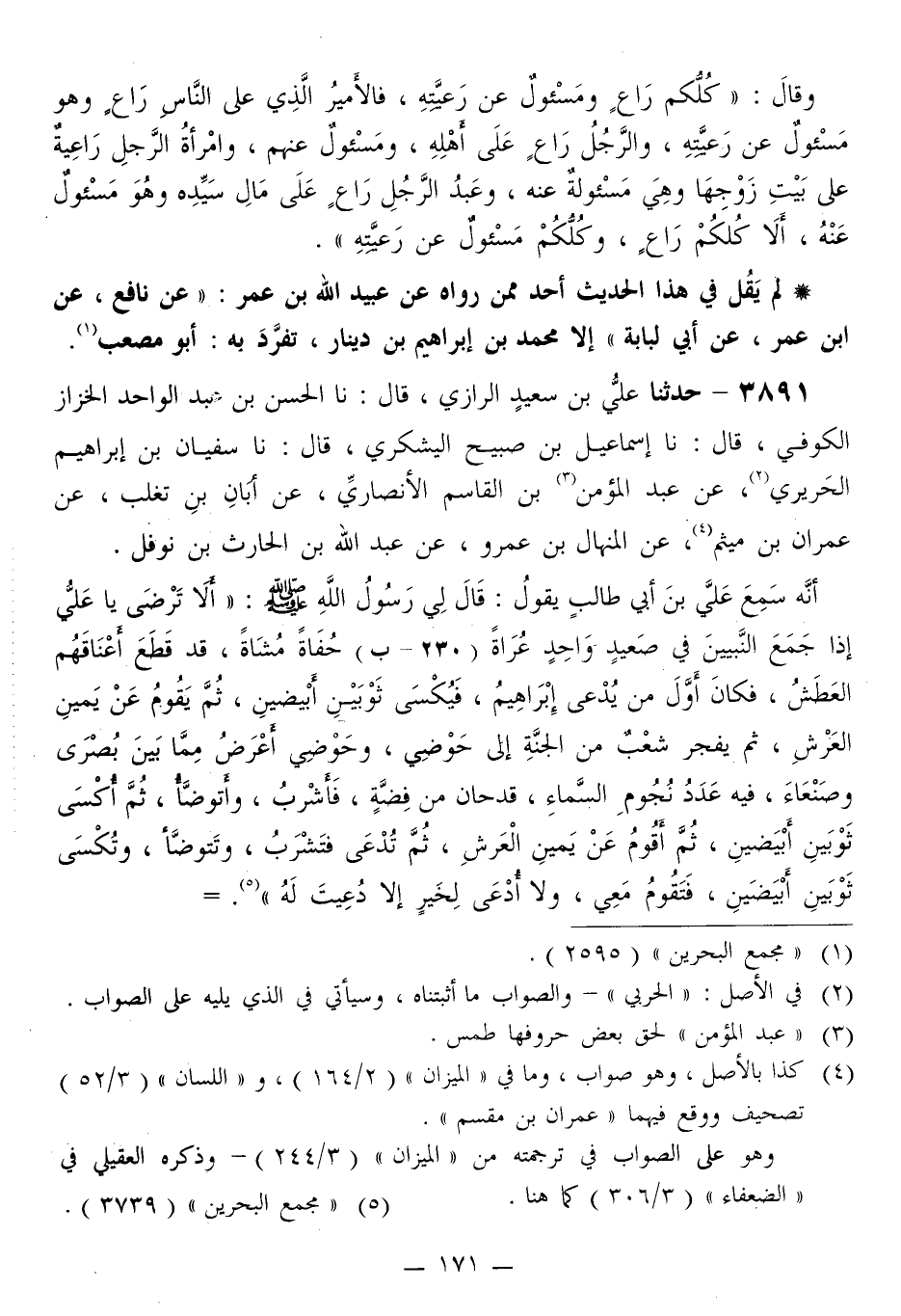 3891 - حَدَّثَنَا عَلِيُّ بْنُ سَعِيدٍ الرَّازِيُّ قَالَ: نا الْحَسَنُ بْنُ عَبْدِ الْوَاحِدِ الْخَزَّازُ الْكُوفِيُّ قَالَ: نا إِسْمَاعِيلُ بْنُ صُبَيْحٍ الْيَشْكُرِيُّ قَالَ: نا سُفْيَانُ بْنُ إِبْرَاهِيمَ الْحَرِيرِيُّ، عَنْ عَبْدِ الْمُؤْمِنِ بْنِ الْقَاسِمِ الْأَنْصَارِيِّ، عَنْ أَبَانَ بْنِ تَغْلِبَ، عَنْ عِمْرَانَ بْنِ مِيثَمٍ، عَنِ الْمِنْهَالِ بْنِ عَمْرٍو، عَنْ عَبْدِ اللَّهِ بْنِ الْحَارِثِ بْنِ نَوْفَلٍ، أَنَّهُ سَمِعَ عَلِيَّ بْنَ أَبِي طَالِبٍ، يَقُولُ: قَالَ لِي رَسُولُ اللَّهِ صَلَّى اللهُ عَلَيْهِ وَسَلَّمَ: «§أَلَا تَرْضَى يَا عَلِيُّ إِذَا جَمَعَ النَّبِيِّينَ فِي صَعِيدٍ وَاحِدٍ عُرَاةً حُفَاةً مُشَاةً، قَدْ قَطَعَ أَعْنَاقَهُمُ الْعَطَشُ، فَكَانَ أَوَّلَ مَنْ يُدْعَى إِبْرَاهِيمُ، فَيُكْسَى ثَوْبَيْنِ أَبْيَضَيْنِ، ثُمَّ يَقُومُ، عَنْ يَمِينِ الْعَرْشِ، ثُمَّ يَفْجُرُ شَعْبٌ مِنَ الْجَنَّةِ إِلَى حَوْضِي، وحَوْضِي أَعْرَضُ مِمَّا بَيْنَ بُصْرَى، وَصَنْعَاءَ، فِيهِ عَدَدُ نُجُومِ السَّمَاءِ، قَدَحَانِ مِنْ فِضَّةٍ، فَأَشْرَبُ، وَأَتَوَضَّأُ، ثُمَّ أُكْسَى ثَوْبَيْنِ أَبْيَضَيْنِ، ثُمَّ أَقُومُ، عَنْ يَمِينِ الْعَرْشِ، ثُمَّ تُدْعَى فَتَشْرَبُ، وَتَتَوَضَّأُ، وَتُكْسَى ثَوْبَيْنِ أَبْيَضَيْنِ، فَتَقُومُ مَعِي، وَلَا أُدْعَى لَخَيْرٍ إِلَّا دُعِيتَ لَهُ»