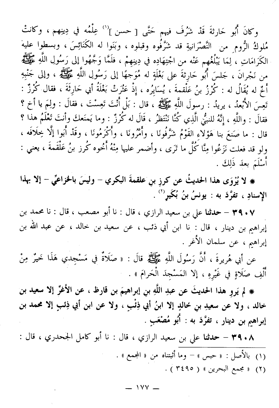 3908 - حَدَّثَنَا عَلِيُّ بْنُ سَعِيدٍ الرَّازِيُّ قَالَ: نا أَبُو كَامِلٍ الْجَحْدَرِيُّ قَالَ: -[178]- نا عَبْدُ الرَّحْمَنِ بْنُ عُثْمَانَ أَبُو بَحْرٍ الْبَكْرَاوِيُّ قَالَ: نا عُبَيْدُ اللَّهِ بْنُ أَبِي زِيَادٍ الْقَدَّاحُ قَالَ: حَدَّثَنِي حَفْصُ بْنُ عُبَيْدِ اللَّهِ بْنِ أَنَسٍ قَالَ: حَدَّثَنِي أَنَسُ بْنُ مَالِكٍ قَالَ: قَالَ رَسُولُ اللَّهِ صَلَّى اللهُ عَلَيْهِ وَسَلَّمَ: «§صَلَاةٌ فِي مَسْجِدِي هَذَا أَفْضَلُ مِنْ أَلْفِ صَلَاةٍ فِيمَا سِوَاهُ، إِلَّا الْمَسْجِدَ الْحَرَامَ»