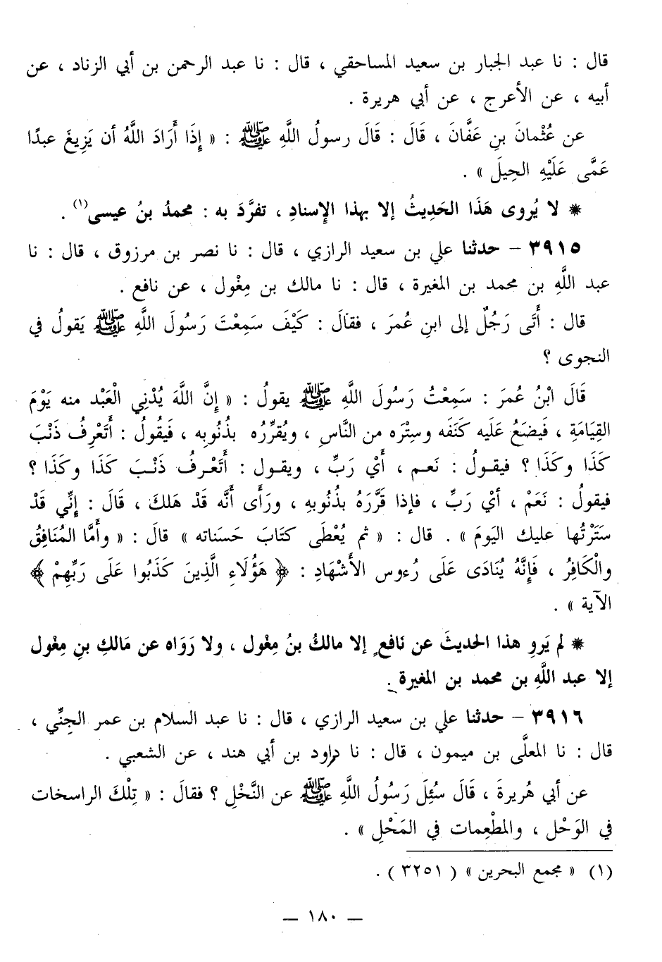 3915 - حَدَّثَنَا عَلِيُّ بْنُ سَعِيدٍ الرَّازِيُّ قَالَ: نا نَصْرُ بْنُ مَرْزُوقٍ قَالَ: نا عَبْدُ اللَّهِ بْنُ مُحَمَّدِ بْنِ الْمُغِيرَةِ قَالَ: نا مَالِكُ بْنُ مِعْوَلٍ، عَنْ نَافِعٍ قَالَ: أَتَى رَجُلٌ إِلَى ابْنِ عُمَرَ، فَقَالَ: كَيْفَ سَمِعْتَ رَسُولَ اللَّهِ صَلَّى اللهُ عَلَيْهِ وَسَلَّمَ يَقُولُ فِي النَّجْوَى؟ قَالَ ابْنُ عُمَرَ: سَمِعْتُ رَسُولَ اللَّهِ صَلَّى اللهُ عَلَيْهِ وَسَلَّمَ يَقُولُ: «إِنَّ اللَّهَ يُدْنِي الْعَبْدَ مِنْهُ يَوْمَ الْقِيَامَةِ، فَيَضَعُ عَلَيْهِ كَنَفَهُ وسِتْرَهُ مِنَ النَّاسِ، وَيُقَرِّرُهُ بِذُنُوبِهِ، فَيَقُولُ: §أَتَعْرِفُ ذَنْبَ كَذَا وَكَذَا؟ فَيَقُولُ: نَعَمْ، أَيْ رَبِّ، وَيَقُولُ: أَتَعْرِفُ ذَنْبَ كَذَا وَكَذَا؟ فَيَقُولُ: نَعَمْ، أَيْ رَبِّ، فَإِذَا قَرَّرَهُ بِذُنُوبِهِ، وَرَأَى أَنَّهُ قَدْ هَلَكَ قَالَ: إِنِّي قَدْ سَتَرْتُهَا عَلَيْكَ الْيَوْمَ قَالَ: ثُمَّ يُعْطَى كِتَابَ حَسَنَاتِهِ قَالَ: وَأَمَّا الْمُنَافِقُ وَالْكَافِرُ، فَإِنَّهُ يُنَادَى عَلَى رُءُوسِ الْأَشْهَادِ: {هَؤُلَاءِ الَّذِينَ كَذَبُوا عَلَى رَبِّهِمْ} [هود: 18] الْآيَةَ»