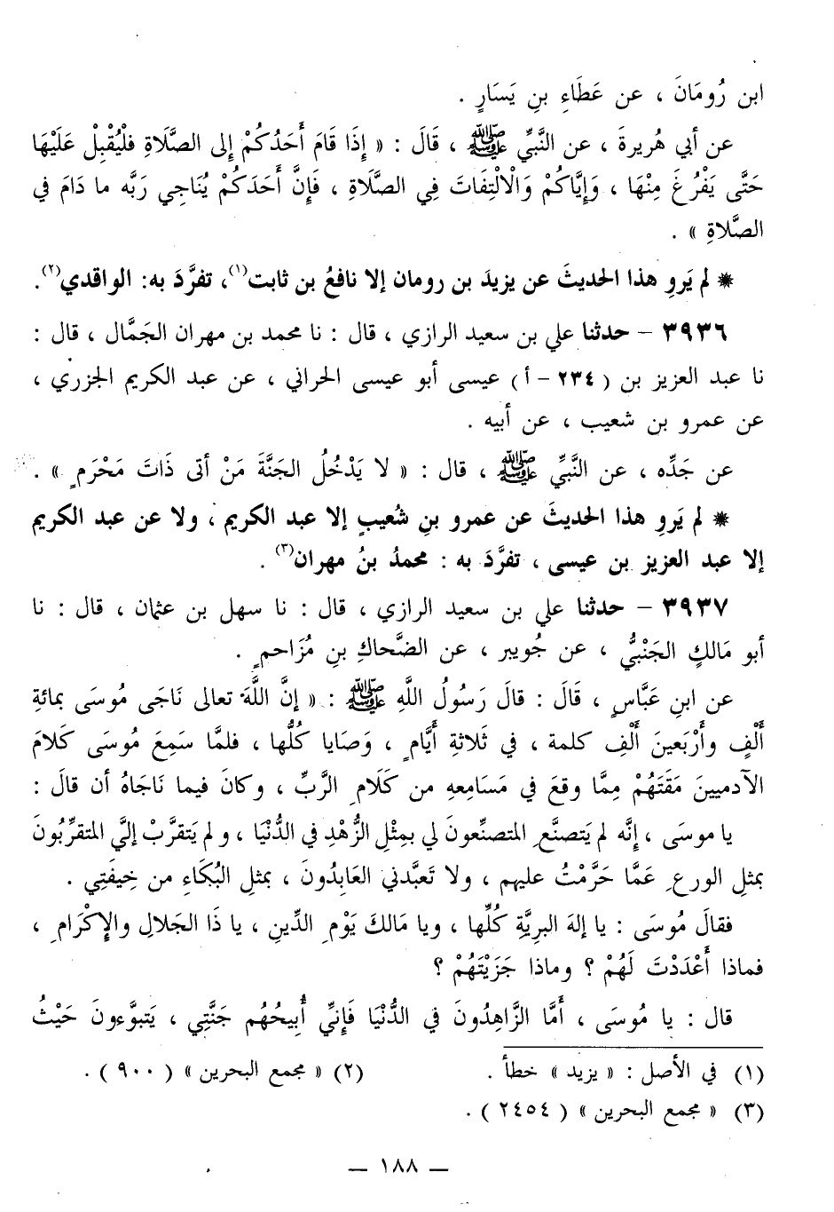 3937 - حَدَّثَنَا عَلِيُّ بْنُ سَعِيدٍ الرَّازِيُّ قَالَ: نا سَهْلُ بْنُ عُثْمَانَ قَالَ: نا أَبُو مَالِكٍ الْجَنْبِيُّ، عَنْ جُوَيْبِرٍ، عَنِ الضَّحَّاكِ بْنِ مُزَاحِمٍ، عَنِ ابْنِ عَبَّاسٍ قَالَ: قَالَ رَسُولُ اللَّهِ صَلَّى اللهُ عَلَيْهِ وَسَلَّمَ: «إِنَّ اللَّهَ تَعَالَى نَاجَى مُوسَى بِمِائَةِ أَلْفٍ وَأَرْبَعِينَ أَلْفَ كَلِمَةٍ، فِي ثَلَاثَةِ أَيَّامٍ، وَصَايَا كُلُّهَا فَلَمَّا سَمِعَ مُوسَى كَلَامَ الْآدَمِيِّينَ مَقَتَهُمْ مِمَّا وَقَعَ فِي مَسَامِعِهِ مِنْ كَلَامِ الرَّبِّ، وَكَانَ فِيمَا نَاجَاهُ أَنْ قَالَ: §يَا مُوسَى، إِنَّهُ لَمْ يَتَصَنَّعِ الْمُتَصَنِّعُونَ لِي بِمِثْلِ الزُّهْدِ فِي الدُّنْيَا، وَلَمْ يَتَقَرَّبْ إِلَيَّ الْمُتَقَرِّبُونَ بِمِثْلِ الْوَرَعِ عَمَّا حَرَّمْتُ عَلَيْهِمْ، وَلَا تَعَبَّدَنِي الْعَابِدُونَ، بِمِثْلِ الْبُكَاءِ مِنْ خِيفَتِي، فَقَالَ مُوسَى: يَا إِلَهَ الْبَرِيَّةِ كُلِّهَا، وَيَا مَالِكَ يَوْمِ الدِّينِ، يَا ذَا الْجِلَالِ وَالْإِكْرَامِ، فَمَاذَا أَعْدَدْتَ لَهُمْ؟ وَمَاذَا جَزَيْتَهُمْ؟ قَالَ: يَا مُوسَى، أَمَّا الزَّاهِدُونَ فِي الدُّنْيَا فَإِنِّي أُبِيحُهُمْ جَنَّتِي، يَتَبَوَّءُونَ حَيْثُ -[189]- يَشَاءُونَ، وَأَمَّا الْوَرَعَةُ عَمَّا حَرَّمْتُ عَلَيْهِمْ، فَإِنَّهُ لَيْسَ مِنْ عَبْدٍ يَلْقَانِي يَوْمَ الْقِيَامَةِ إِلَّا نَاقَشْتُهُ الْحِسَابَ، وَنَاقَشْتُهُ عَمَّا كَانَ فِي يَدَيْهِ، إِلَّا مَا كَانَ مِنَ الْوَرِعِينَ، فَإِنِّي أَسْتَحْيِيهِمْ وَأُجِلُّهُمْ فَأُدْخِلُهُمُ الْجَنَّةَ بِغَيْرِ حِسَابٍ، وَأَمَّا الْبَكَّاؤُنَ مِنْ خِيفَتِي فَلَهُمُ الرَّفِيقُ الْأَعْلَى، لَا يُشَارَكُونَ فِيهِ»