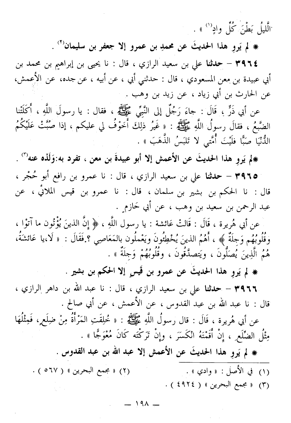 3966 - حَدَّثَنَا عَلِيُّ بْنُ سَعِيدٍ الرَّازِيُّ قَالَ: نا عَبْدُ اللَّهِ بْنُ دَاهِرٍ الرَّازِيُّ قَالَ: نا عَبْدُ اللَّهِ بْنُ عَبْدِ الْقُدُّوسِ، عَنِ الْأَعْمَشِ، عَنْ أَبِي صَالِحٍ، عَنْ أَبِي هُرَيْرَةَ قَالَ: قَالَ رَسُولُ اللَّهِ صَلَّى اللهُ عَلَيْهِ وَسَلَّمَ: «§خُلِقْتِ الْمَرْأَةُ مِنْ ضِلَعٍ، فَمِثْلُهَا مِثْلُ الضِّلَعِ، إِنْ أَقَمْتَهُ انْكَسَرَ، وَإِنْ تَرَكْتَهُ كَانَ مُعْوَجًّا»