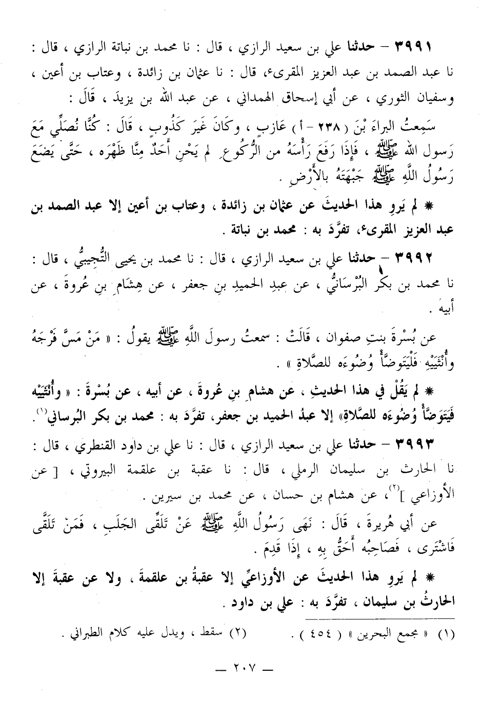 3992 - حَدَّثَنَا عَلِيُّ بْنُ سَعِيدٍ الرَّازِيُّ قَالَ: نا مُحَمَّدُ بْنُ يَحْيَى التُّجِيبِيُّ قَالَ: نا مُحَمَّدُ بْنُ بَكْرٍ الْبُرْسَانِيُّ، عَنْ عَبْدِ الْحَمِيدِ بْنِ جَعْفَرٍ، عَنْ هِشَامِ بْنِ عُرْوَةَ، عَنْ أَبِيهِ، عَنْ بُسْرَةَ بِنْتِ صَفْوَانَ، قَالَتْ: سَمِعْتُ رَسُولَ اللَّهِ صَلَّى اللهُ عَلَيْهِ وَسَلَّمَ يَقُولُ: «§مَنْ مَسَّ فَرْجَهُ وَأُنْثَيَيْهِ فَلْيَتَوَضَّأْ وُضُوءَهُ لِلصَّلَاةِ» لَمْ يَقُلْ فِي هَذَا الْحَدِيثِ، عَنْ هِشَامِ بْنِ عُرْوَةَ، عَنْ أَبِيهِ، عَنْ بُسْرَةَ: «وَأُنْثَيَيْهِ فَيَتَوَضَّأْ وُضُوءَهُ لِلصَّلَاةِ» إِلَّا عَبْدُ الْحَمِيدِ بْنُ جَعْفَرٍ، تَفَرَّدَ بِهِ: مُحَمَّدُ بْنُ بَكْرٍ الْبُرْسَانِيُّ