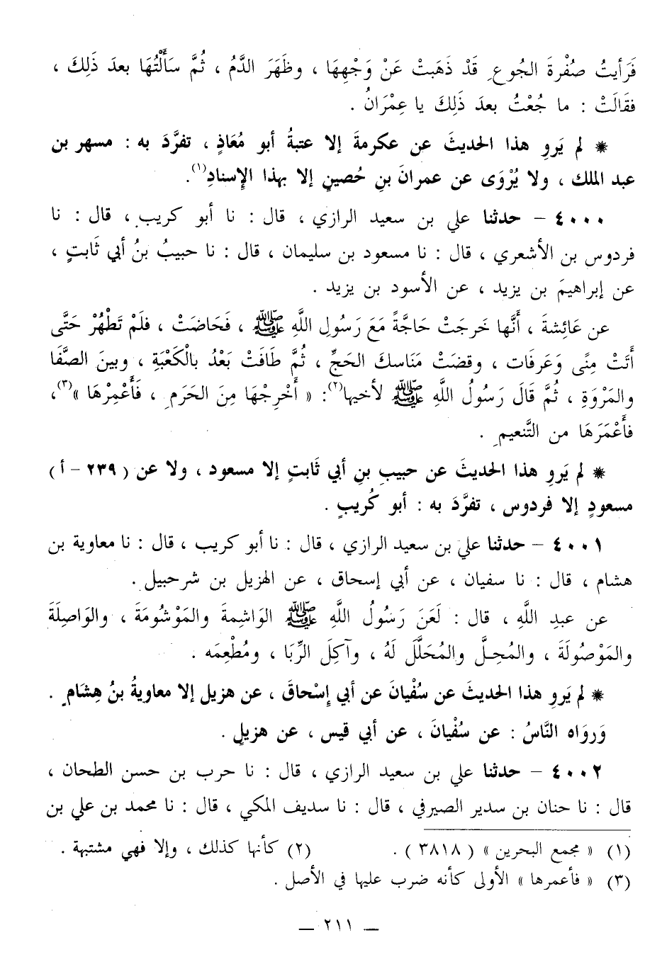 4001 - حَدَّثَنَا عَلِيُّ بْنُ سَعِيدٍ الرَّازِيُّ قَالَ: نا أَبُو كُرَيْبٍ قَالَ: نا مُعَاوِيَةُ بْنُ هِشَامٍ قَالَ: نا سُفْيَانُ، عَنْ أَبِي إِسْحَاقَ، عَنِ الْهُزَيْلِ بْنِ شُرَحْبِيلَ، عَنْ عَبْدِ اللَّهِ قَالَ: «§لَعَنَ رَسُولُ اللَّهِ صَلَّى اللهُ عَلَيْهِ وَسَلَّمَ الْوَاشِمَةَ وَالْمَوْشُومَةَ، وَالْوَاصِلَةَ وَالْمَوْصُولَةَ، وَالْمُحِلَّ وَالْمُحَلَّلَ لَهُ، وَآكِلَ الرِّبَا، وَمَطْعِمَهُ»