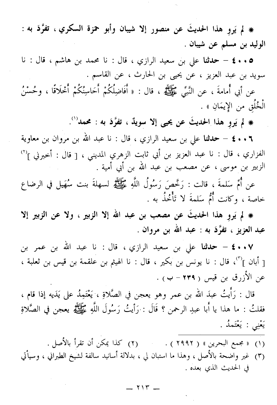 4007 - حَدَّثَنَا عَلِيُّ بْنُ سَعِيدٍ الرَّازِيُّ قَالَ: نا عَبْدُ اللَّهِ بْنُ عُمَرَ بْنِ أَبَانَ قَالَ: نا يُونُسُ بْنُ بُكَيْرٍ قَالَ: نا الْهَيْثَمُ بْنُ عَلْقَمَةَ بْنِ قَيْسِ بْنِ ثَعْلَبَةَ، عَنِ الْأَزْرَقِ بْنِ قَيْسٍ قَالَ: رَأَيْتُ عَبْدَ اللَّهِ بْنَ عُمَرَ وَهُوَ يَعْجِنُ فِي الصَّلَاةِ يَعْتَمِدُ عَلَى يَدَيْهِ إِذَا قَامَ، فَقُلْتُ: مَا هَذَا يَا أَبَا عَبْدِ الرَّحْمَنِ؟ قَالَ: «§رَأَيْتُ رَسُولَ اللَّهِ صَلَّى اللهُ عَلَيْهِ وَسَلَّمَ يُعْجِنُ فِي الصَّلَاةِ» ، يَعْنِي: يَعْتَمِدُ، «-[214]- لَمْ يَرْوِ هَذَا الْحَدِيثَ عَنِ الْأَزْرَقِ إِلَّا الْهَيْثَمُ، تَفَرَّدَ بِهِ: يُونُسُ بْنُ بُكَيْرٍ»