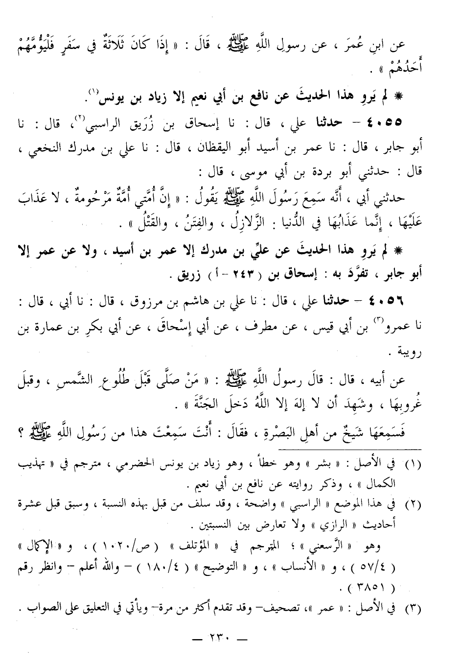 4056 - حَدَّثَنَا عَلِيٌّ قَالَ: نا عَلِيُّ بْنُ هَاشِمِ بْنِ مَرْزُوقٍ قَالَ: نا أَبِي قَالَ: نا عَمْرُو بْنُ أَبِي قَيْسٍ، عَنْ مُطَرِّفٍ، عَنْ أَبِي إِسْحَاقَ، عَنْ أَبِي بَكْرِ بْنِ عُمَارَةَ بْنِ رُوَيْبَةَ، عَنْ أَبِيهِ قَالَ: قَالَ رَسُولُ اللَّهِ صَلَّى اللهُ عَلَيْهِ وَسَلَّمَ: «§مَنْ صَلَّى قَبْلَ طُلُوعِ الشَّمْسِ، وَقَبْلَ غُرُوبِهَا، وَشَهِدَ أَنْ لَا إِلَهَ إِلَّا اللَّهُ دَخَلَ الْجَنَّةَ» فَسَمِعَهَا شَيْخٌ مِنْ أَهْلِ الْبَصْرَةِ، فَقَالَ: أَنْتَ سَمِعْتَ هَذَا مِنْ رَسُولِ اللَّهِ صَلَّى اللهُ عَلَيْهِ وَسَلَّمَ؟ -[231]- قَالَ نَعَمْ ثَلَاثَ مَرَّاتٍ «