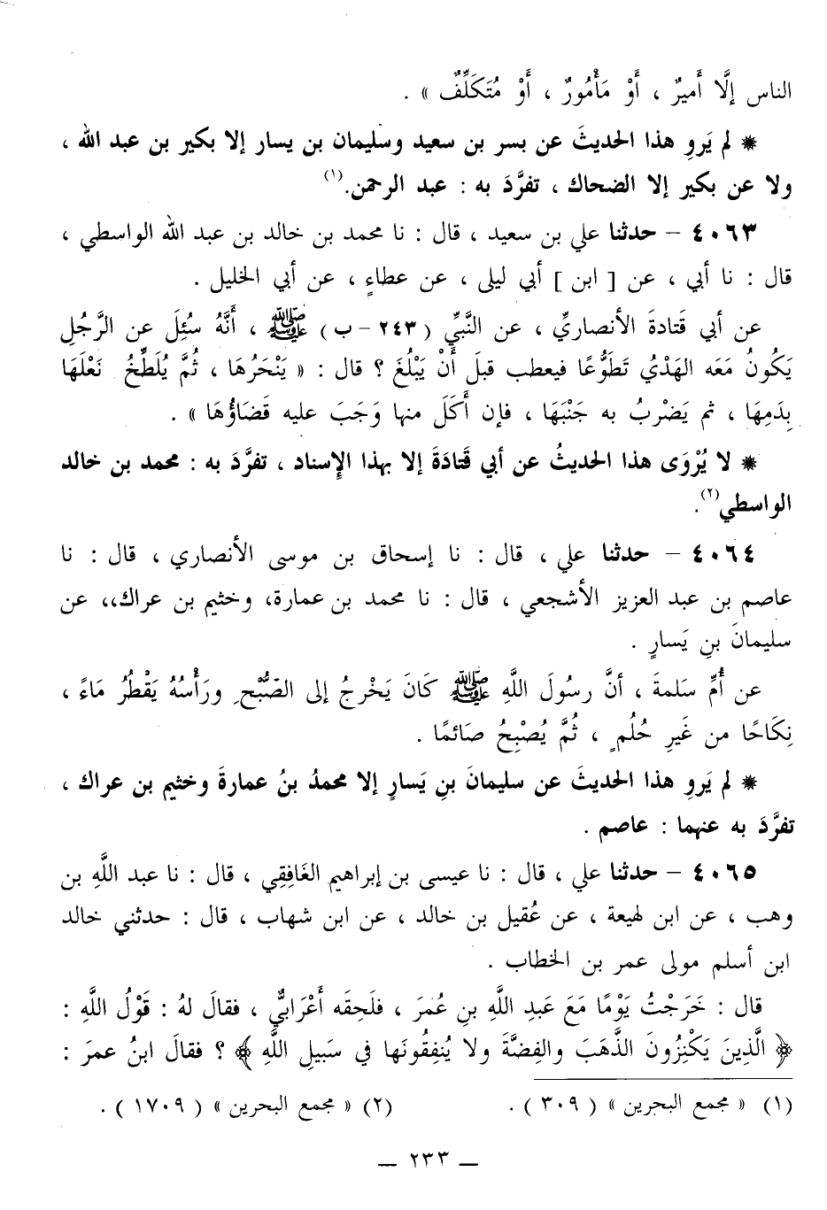 4065 - حَدَّثَنَا عَلِيٌّ قَالَ: نا عِيسَى بْنُ إِبْرَاهِيمَ الْغَافِقِيُّ قَالَ: نا عَبْدُ اللَّهِ بْنُ وَهْبٍ، عَنِ ابْنِ لَهِيعَةَ، عَنْ عُقَيْلِ بْنِ خَالِدٍ، عَنِ ابْنِ شِهَابٍ قَالَ: حَدَّثَنِي خَالِدُ بْنُ أَسْلَمَ، مَوْلَى عُمَرَ بْنِ الْخَطَّابِ قَالَ: خَرَجْتُ يَوْمًا مَعَ عَبْدِ اللَّهِ بْنِ عُمَرَ، فَلَحِقَهُ أَعْرَابِيٌّ، فَقَالَ لَهُ: قَوْلُ اللَّهِ: {الَّذِينَ يَكْنِزُونَ الذَّهَبَ وَالْفِضَّةَ وَلَا يُنْفِقُونَهَا فِي سَبِيلِ اللَّهِ} [التوبة: 34] فَقَالَ ابْنُ عُمَرَ: «§-[234]- مَنْ كَنْزَهُمَا فَلَمْ يُؤَدِّ زَكَاتَهُمَا فَوَيْلٌ لَهُ، إِنَّمَا كَانَ هَذَا قَبْلَ أَنْ تَنْزِلَ الزَّكَاةُ، فَلَمَّا نَزَلَتْ جَعَلَهَا اللَّهُ طَهُورًا لِلْأَمْوَالِ» ، ثُمَّ الْتَفَتَ فَقَالَ: «مَا أُبَالِي أَنْ لَوْ كَانَ مِثْلُ أُحُدٍ ذَهَبًا، أَعْلَمُ عَدَدَهُ، وَأُزَكِّيهِ، وأَعْمَلُ فِيهِ بِطَاعَةِ اللَّهِ»