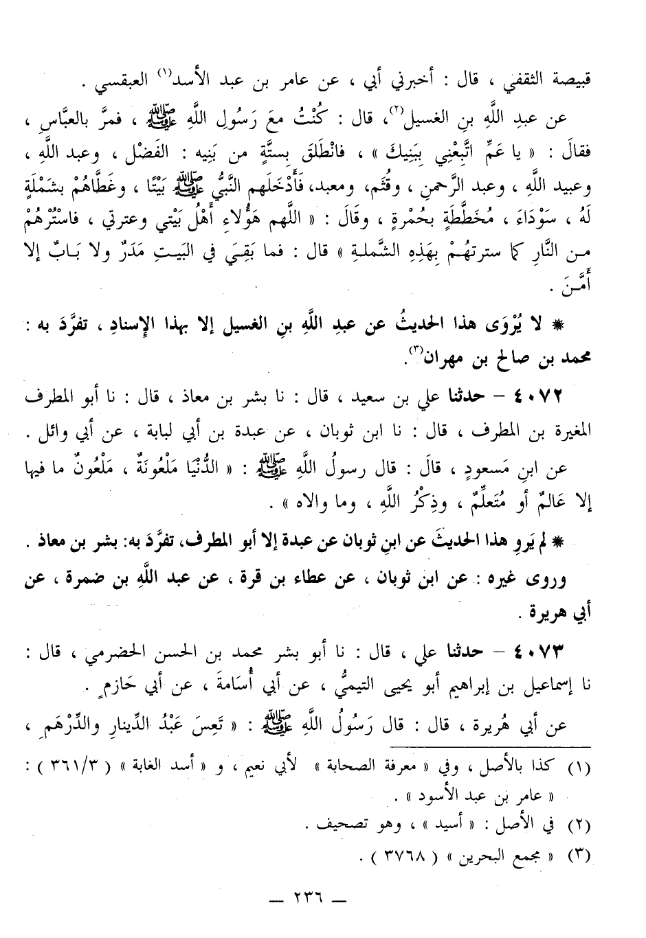 4072 - حَدَّثَنَا عَلِيُّ بْنُ سَعِيدٍ قَالَ: نا بِشْرُ بْنُ مُعَاذٍ قَالَ: نا أَبُو الْمُطَرِّفِ الْمُغِيرَةُ بْنُ الْمُطَرِّفِ قَالَ: نا ابْنُ ثَوْبَانَ، عَنْ عَبْدَةَ بْنِ أَبِي لُبَابَةَ، عَنِ أَبِي وَائِلٍ، عَنِ ابْنِ مَسْعُودٍ قَالَ: قَالَ رَسُولُ اللَّهِ صَلَّى اللهُ عَلَيْهِ وَسَلَّمَ: «§الدُّنْيَا مَلْعُونَةٌ، مَلْعُونٌ مَا فِيهَا إِلَّا عَالِمٌ أَوْ مُتَعَلِّمٌ، وَذِكْرُ اللَّهَ، وَمَا وَالَاهُ»