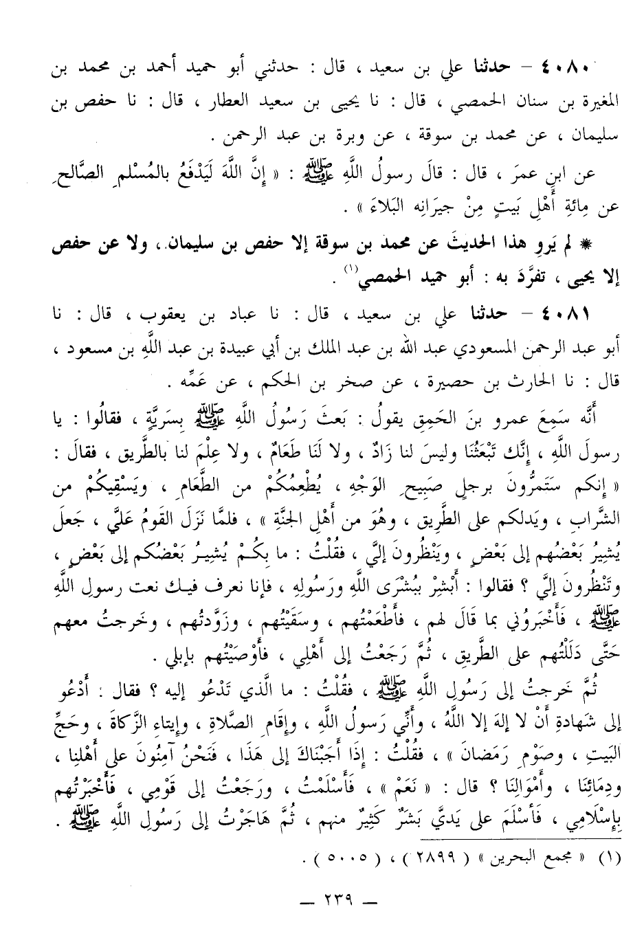 4081 - حَدَّثَنَا عَلِيُّ بْنُ سَعِيدٍ قَالَ: نا عَبَّادُ بْنُ يَعْقُوبَ قَالَ: نا أَبُو عَبْدِ الرَّحْمَنِ الْمَسْعُودِيُّ عَبْدُ اللَّهِ بْنُ عَبْدِ الْمَلِكِ بْنِ أَبِي عُبَيْدَةَ بْنِ عَبْدِ اللَّهِ بْنِ مَسْعُودٍ قَالَ: نا الْحَارِثُ بْنُ حَصِيرَةَ، عَنْ صَخْرِ بْنِ الْحَكَمِ، عَنْ عَمِّهِ، أَنَّهُ سَمِعَ عَمْرَو بْنَ الْحَمِقِ، يَقُولُ: بَعَثَ رَسُولُ اللَّهِ صَلَّى اللهُ عَلَيْهِ وَسَلَّمَ بِسَرِيَّةٍ، فَقَالُوا: يَا رَسُولَ اللَّهِ، إِنَّكَ تَبْعَثُنَا وَلَيْسَ لَنَا زَادٌ، وَلَا لَنَا طَعَامٌ، وَلَا عِلْمَ لَنَا بِالطَّرِيقِ، فَقَالَ: «§إِنَّكُمْ سَتَمُرُّونَ بِرَجُلٍ صَبِيحِ الْوَجْهِ، يُطْعِمُكُمْ مِنَ الطَّعَامِ، وَيَسْقِيكُمْ مِنَ الشَّرَابِ، وَيَدُلُّكُمْ عَلَى الطَّرِيقِ، وَهُوَ مِنْ أَهْلِ الْجَنَّةِ» ، فَلَمَّا نَزَلَ الْقَوْمُ عَلَيَّ جَعَلَ يُشِيرُ بَعْضُهُمْ إِلَى بَعْضٍ ويَنْظُرُونَ إِلَيَّ فَقُلْتُ: مَا بِكُمْ يُشِيرُ بَعْضُكُمْ إِلَى بَعْضٍ، وتَنْظُرُونَ إِلَيَّ؟ فَقَالُوا: أَبْشِرْ بِبُشْرَى اللَّهِ وَرَسُولِهِ، فَإِنَّا نَعْرِفُ فِيكَ نَعْتَ رَسُولِ اللَّهِ صَلَّى اللهُ عَلَيْهِ وَسَلَّمَ فَأَخْبَرُونِي بِمَا قَالَ لَهُمْ: فَأَطْعَمْتُهُمْ، وَسَقَيْتُهُمْ، وزَوَّدْتُهُمْ، وَخَرَجْتُ مَعَهُمْ حَتَّى دَلَّلْتُهُمْ عَلَى الطَّرِيقِ