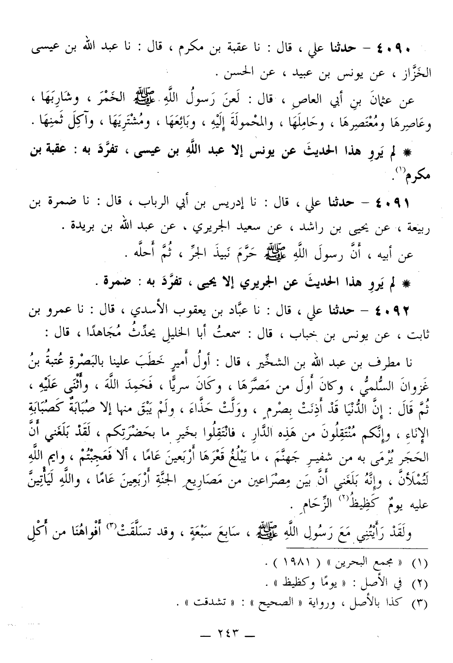4092 - حَدَّثَنَا عَلِيٌّ قَالَ: نا عَبَّادُ بْنُ يَعْقُوبَ الْأَسَدِيُّ قَالَ: نا عَمْرُو بْنُ ثَابِتٍ، عَنْ يُونُسَ بْنِ خَبَّابٍ قَالَ: سَمِعْتُ أَبَا الْخَلِيلِ، يُحَدِّثُ مُجَاهِدًا قَالَ: نا مُطَرِّفُ بْنُ عَبْدِ اللَّهِ بْنِ الشِّخِّيرِ قَالَ: أَوَّلُ أَمِيرٍ خَطَبَ عَلَيْنَا بِالْبَصْرَةِ عُتْبَةُ بْنُ غَزْوَانَ السُّلَمِيُّ، وَكَانَ أَوَّلَ مَنْ مَصَّرَهَا، وَكَانَ بَدْرِيًّا، فَحَمِدَ اللَّهَ، وَأَثْنَى عَلَيْهِ، ثُمَّ قَالَ: إِنَّ الدُّنْيَا قَدْ آذَنَتْ بِصَرْمٍ، وَوَلَّتْ حَذَّاءَ، وَلَمْ يَبْقَ مِنْهَا إِلَّا صُبَابَةٌ كَصُبَابَةِ الْإِنَاءِ، وَإِنَّكُمْ مُنْتَقِلُونَ مِنْ هَذِهِ الدَّارِ، فَانْتَقِلُوا بِخَيْرِ مَا بِحَضْرَتِكُمْ، لَقَدْ بَلَغَنِي أَنَّ §الْحَجَرَ يُرْمَى بِهِ مِنْ شَفِيرِ جَهَنَّمَ، مَا يَبْلُغُ قَعْرَهَا أَرْبَعِينَ عَامًا، ألَا فَعَجِبْتُمْ، وَايْمُ اللَّهِ لتُمْلَأَنَّ، وَإِنَّهُ بَلَغَنِي أَنَّ بَيْنَ مِصْرَاعَيْنِ مِنْ مَصَارِيعِ الْجَنَّةِ أَرْبَعِينَ عَامًا، وَاللَّهِ لَيَأْتِيَنَّ عَلَيْهِ يَوْمٌ كَظِيظُ الزِّحَامِ، «وَلَقَدْ رَأَيْتُنِي مَعَ رَسُولِ اللَّهِ صَلَّى اللهُ عَلَيْهِ وَسَلَّمَ، سَابِعَ سَبْعَةٍ، وَقَدْ تَسَلَّقَتْ أَفْوَاهُنَا مِنْ أَكْلِ -[244]- الشَّجَرِ» ، وَلَقَدْ رَأَيْتُنِي وَسَعْدًا اشْتَقَقْنَا بُرْدَةً نِصْفَيْنِ فَلَبِسْتُ نِصْفَهَا، وَلَبِسَ سَعْدٌ نِصْفَهَا، وَمَا مِنَّا الْيَوْمَ إِلَّا أَمِيرٌ عَلَى مِصْرٍ مِنْ هَذِهِ الْأَمْصَارِ، وَإنَّهُ بَلَغَنِي أَنَّهَا لَمْ تَكُنْ نُبُوَّةٌ إِلَّا نَسَخَتْ مُلْكًا، وَإِنِّي أَعُوذُ بِاللَّهِ أَنْ أَكُونَ فِي نَفْسِي عَظِيمًا، وَفِي أَعْيُنِ النَّاسِ حَقِيرًا، وَسَتُجَرِّبُونَ الْأُمَرَاءَ بَعْدِي «