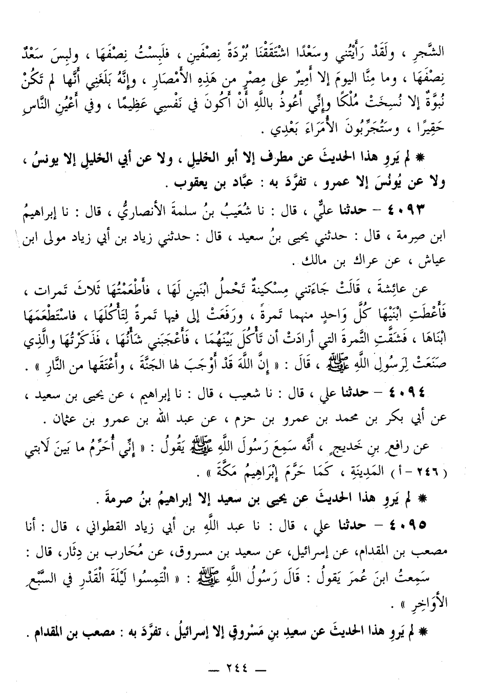 4093 - حَدَّثَنَا عَلِيٌّ قَالَ: نا شُعَيْبُ بْنُ سَلَمَةَ الْأَنْصَارِيُّ قَالَ: نا إِبْرَاهِيمُ بْنُ صِرْمَةَ قَالَ: حَدَّثَنِي يَحْيَى بْنُ سَعِيدٍ قَالَ: حَدَّثَنِي زِيَادُ بْنُ أَبِي زِيَادٍ مَوْلَى ابْنِ عَيَّاشٍ، عَنْ عِرَاكِ بْنِ مَالِكٍ، عَنْ عَائِشَةَ، قَالَتْ: جَاءَتْنِي مِسْكِينَةٌ تَحْمِلُ ابْنَيْنِ لَهَا، فَأَطْعَمْتُهَا ثَلَاثَ تَمَرَاتٍ، فَأَعْطَتِ ابْنَيْهَا كُلَّ وَاحِدٍ مِنْهُمَا تَمْرَةً، وَرَفَعَتْ إِلَى فِيهَا تَمْرَةً لِتَأْكُلَهَا، فَاسْتَطْعَمَهَا ابْنَاهَا، فَشَقَّتِ التَّمْرَةَ الَّتِي أَرَادَتْ أَنْ تَأْكُلَ بَيْنَهُمَا، فَأَعْجَبَنِي شَأْنُهَا، فَذَكَرْتُهَا وَالَّذِي صَنَعَتْ لِرَسُولِ اللَّهِ صَلَّى اللهُ عَلَيْهِ وَسَلَّمَ قَالَ: «إِنَّ §اللَّهَ قَدْ أَوْجَبَ لَهَا الْجَنَّةَ، وَأَعْتَقَهَا مِنَ النَّارِ»