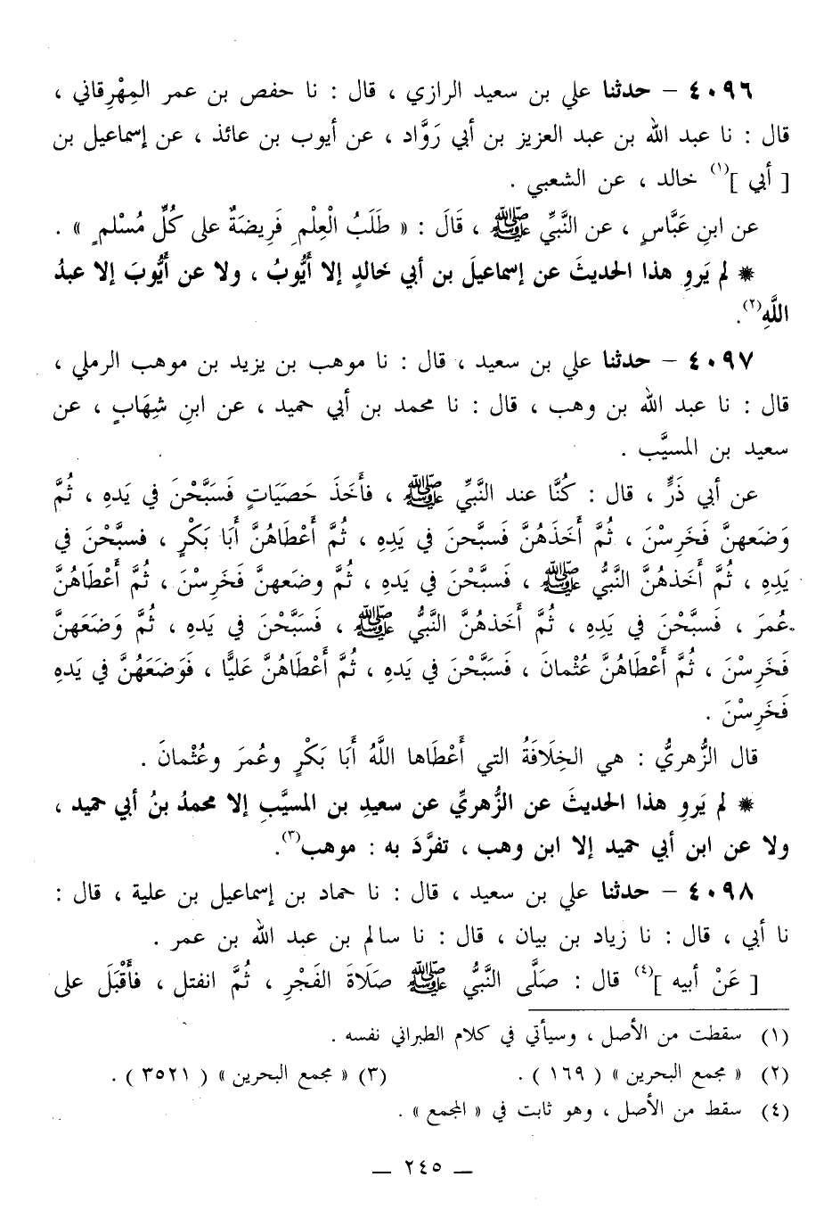 4096 - حَدَّثَنَا عَلِيُّ بْنُ سَعِيدٍ الرَّازِيُّ قَالَ: نا حَفْصُ بْنُ عُمَرَ الْمِهْرِقَانِيُّ قَالَ: نا عَبْدُ اللَّهِ بْنُ عَبْدِ الْعَزِيزِ بْنِ أَبِي رَوَّادٍ، عَنْ أَيُّوبَ بْنِ عَائِذٍ، عَنْ إِسْمَاعِيلَ بْنِ أَبِي خَالِدٍ، عَنِ الشَّعْبِيِّ، عَنِ ابْنِ عَبَّاسٍ، عَنِ النَّبِيِّ صَلَّى اللهُ عَلَيْهِ وَسَلَّمَ قَالَ: «§طَلَبُ الْعِلْمِ فَرِيضَةٌ عَلَى كُلِّ مُسْلِمٍ»