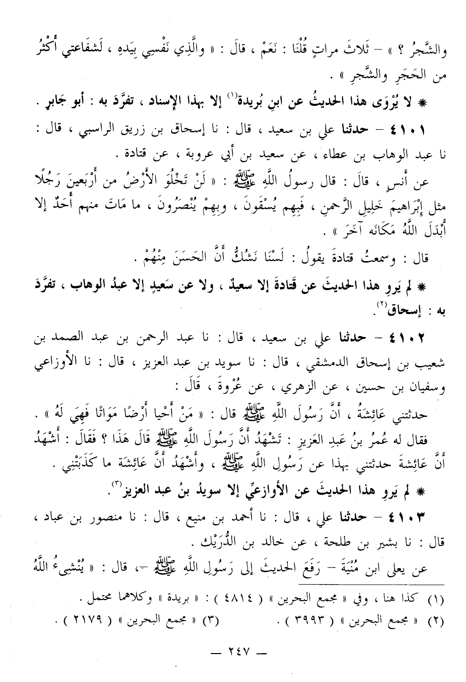 4101 - حَدَّثَنَا عَلِيُّ بْنُ سَعِيدٍ قَالَ: نا إِسْحَاقُ بْنُ زُرَيْقٍ الرَّاسِبِيُّ قَالَ: نا عَبْدُ الْوَهَّابِ بْنُ عَطَاءٍ، عَنْ سَعِيدِ بْنِ أَبِي عَرُوبَةَ، عَنْ قَتَادَةَ، عَنْ أَنَسٍ قَالَ: قَالَ رَسُولُ اللَّهِ صَلَّى اللهُ عَلَيْهِ وَسَلَّمَ: «§لَنْ تَخْلُوَ الْأَرْضُ مِنْ أَرْبَعِينَ رَجُلًا مِثْلَ إِبْرَاهِيمَ خَلِيلِ الرَّحْمَنِ، فَبِهِمْ يُسْقَوْنَ وَبِهِمْ يُنْصَرُونَ، مَا مَاتَ مِنْهُمْ أَحَدٌ إِلَّا أَبْدَلَ اللَّهُ مَكَانَهُ آخَرَ» قَالَ: وَسَمِعْتُ قَتَادَةَ يَقُولُ: «لَسْنَا نَشُكُّ أَنَّ الْحَسَنَ مِنْهُمْ»