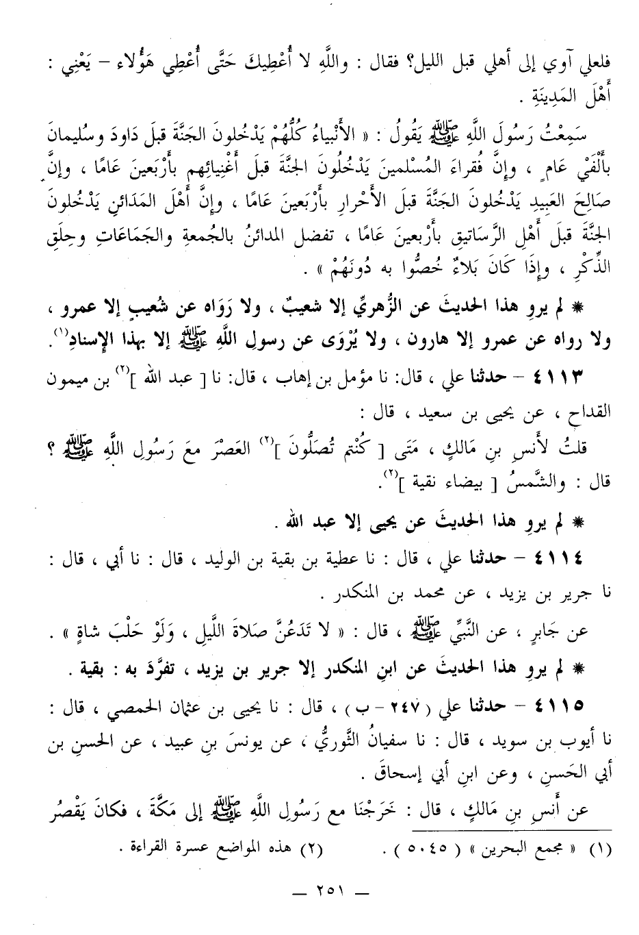4113 - حَدَّثَنَا عَلِيٌّ قَالَ: نا مُؤَمَّلُ بْنُ إِهَابٍ قَالَ: نا عَبْدُ اللَّهِ بْنُ مَيْمُونٍ الْقدَّاحُ، عَنْ يَحْيَى بْنِ سَعِيدٍ قَالَ: قُلْتُ لِأَنَسِ بْنِ مَالِكٍ: §مَتَى كُنْتُمْ تُصَلُّونَ الْعَصْرَ مَعَ رَسُولِ اللَّهِ صَلَّى اللهُ عَلَيْهِ وَسَلَّمَ؟ قَالَ: «وَالشَّمْسُ بَيْضَاءُ نَقِيَّةٌ»