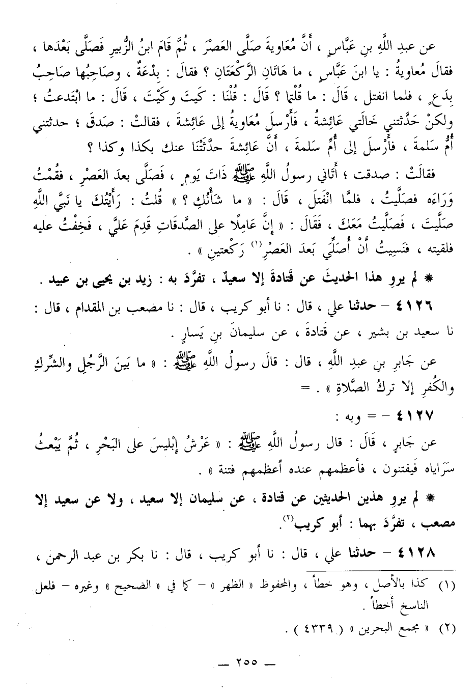 عَنْ عَبْدِ اللَّهِ بْنِ عَبَّاسٍ، أَنَّ مُعَاوِيَةَ، صَلَّى الْعَصْرَ، ثُمَّ قَامَ ابْنُ الزُّبَيْرِ فَصَلَّى بَعْدَهَا، فَقَالَ: مُعَاوِيَةُ: يَا ابْنَ عَبَّاسٍ، مَا هَاتَانِ الرَّكْعَتَانِ؟ فَقَالَ: بِدْعَةٌ وَصَاحِبُهَا صَاحِبُ بِدَعٍ، فَلَمَّا انْفَتَلَ قَالَ: مَا قُلْتُمَا؟ قَالَ: قُلْنَا: كَيْتَ وَكَيْتَ قَالَ: مَا ابْتَدَعْتُ، وَلَكِنْ حَدَّثَتْنِي خَالَتِي عَائِشَةُ، فَأَرْسَلَ مُعَاوِيَةُ إِلَى عَائِشَةَ، فَقَالَتْ: صَدَقَ، حَدَّثَتْنِي أُمُّ سَلَمَةَ فَأَرْسَلَ إِلَى أُمِّ سَلَمَةَ، أَنَّ عَائِشَةَ، حَدَّثَتْنَا عَنْكِ بِكَذَا وَكَذَا؟ فَقَالَتْ: صَدَقَتْ، أَتَانِي رَسُولُ اللَّهِ صَلَّى اللهُ عَلَيْهِ وَسَلَّمَ ذَاتَ يَوْمٍ، فَصَلَّى بَعْدَ الْعَصْرِ، فَقُمْتُ وَرَاءَهُ فَصَلَّيْتُ، فَلَمَّا انْفَتَلَ قَالَ: «مَا شَأْنُكِ؟» قُلْتُ: رَأَيْتُكَ يَا نَبِيَّ اللَّهِ صَلَّيْتَ، فَصَلَّيْتُ مَعَكَ، فَقَالَ: «§إِنَّ عَامِلًا عَلَى الصَّدَقَاتِ قَدِمَ عَلَيَّ، فَخِفْتُ عَلَيْهِ فَلَقِيتُهُ، فَنَسِيتُ أَنْ أُصَلِّيَ بَعْدَ الْعَصْرِ رَكْعَتَيْنِ»
