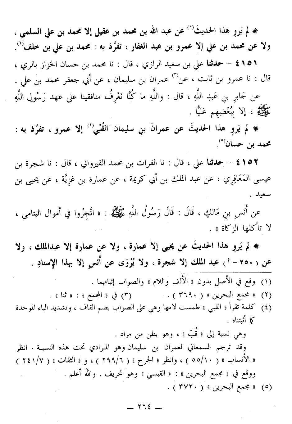 لَمْ يَرْوِ هَذَا الْحَدِيثَ عَنْ عِمْرَانَ بْنِ سُلَيْمَانَ الْقُبِّيِّ إِلَّا عَمْرٌو، تَفَرَّدَ بِهِ: مُحَمَّدُ بْنُ حَسَّانَ "