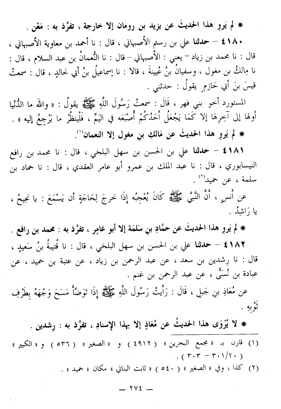 4181 - حَدَّثَنَا عَلِيُّ بْنُ الْحَسَنِ بْنِ سَهْلٍ الْبَلْخِيُّ قَالَ: نا مُحَمَّدُ بْنُ رَافِعٍ النَّيْسَابُورِيُّ قَالَ: نا عَبْدُ الْمَلِكِ بْنُ عَمْرٍو أَبُو عَامِرٍ الْعَقَدِيُّ قَالَ: نا حَمَّادُ بْنُ سَلَمَةَ، عَنْ حُمَيْدٍ، عَنْ أَنَسٍ: «أَنَّ النَّبِيَّ صَلَّى اللهُ عَلَيْهِ وَسَلَّمَ §كَانَ يُعْجِبُهُ إِذَا خَرَجَ لِحَاجَةٍ أَنْ يَسْمَعَ: يَا نَجِيحُ، يَا رَاشِدُ»