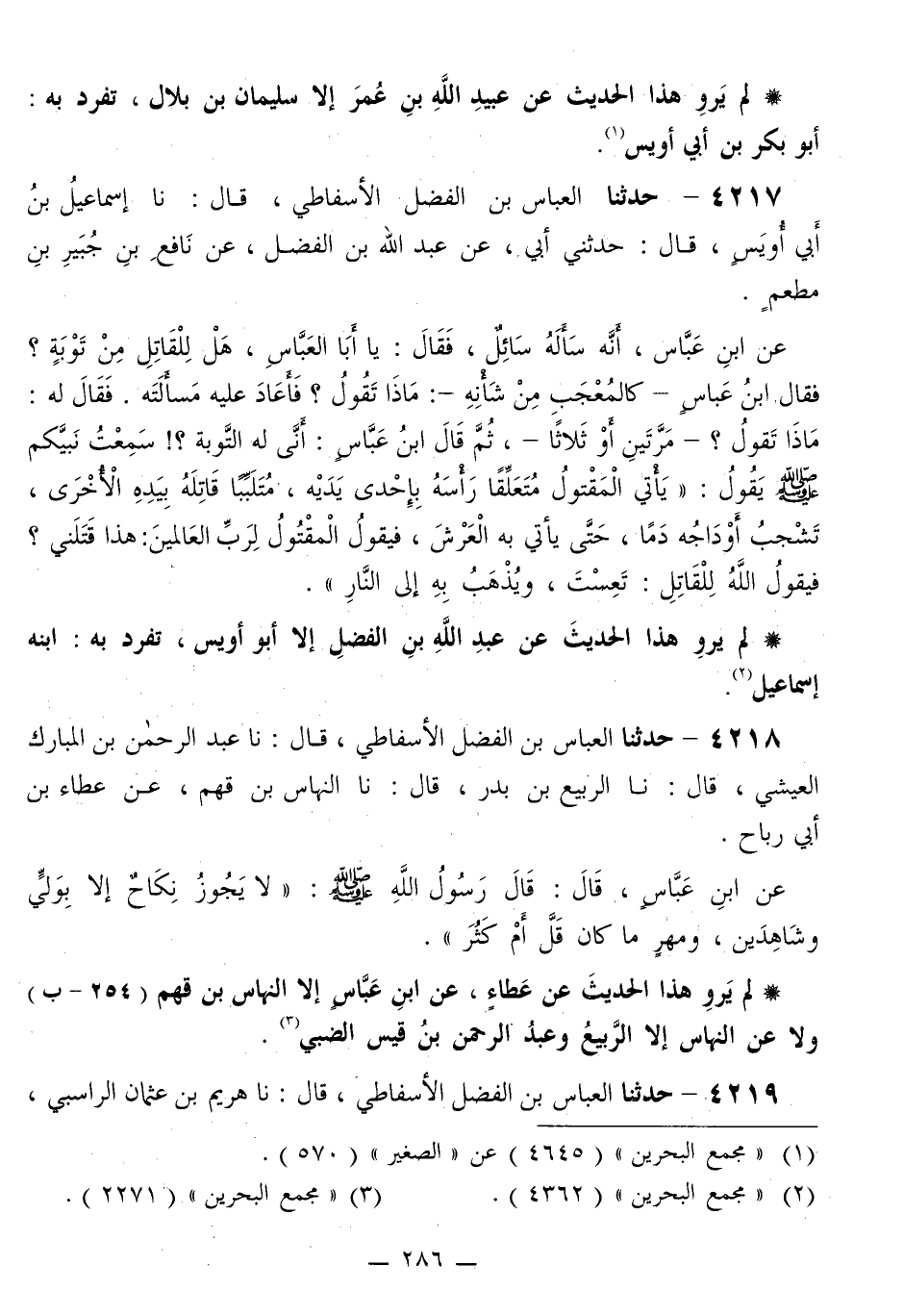 4217 - حَدَّثَنَا الْعَبَّاسُ بْنُ الْفَضْلِ الْأَسْفَاطِيُّ قَالَ: نا إِسْمَاعِيلُ بْنُ أَبِي أُوَيْسٍ قَالَ: حَدَّثَنِي أَبِي، عَنْ عَبْدِ اللَّهِ بْنِ الْفَضْلِ، عَنْ نَافِعِ بْنِ جُبَيْرِ بْنِ مُطْعِمٍ، عَنِ ابْنِ عَبَّاسٍ، أَنَّهُ سَأَلَهُ سَائِلٌ، فَقَالَ: يَا أَبَا الْعَبَّاسِ، هَلْ لِلْقَاتِلِ مِنْ تَوْبَةٍ؟ فَقَالَ ابْنُ عَبَّاسٍ كَالْمُعْجَبِ مِنْ شَأْنِهِ: مَاذَا تَقُولُ؟ فَأَعَادَ عَلَيْهِ مَسْأَلَتَهُ فَقَالَ لَهُ: مَاذَا تَقُولُ؟ مَرَّتَيْنِ أَوْ ثَلَاثًا، ثُمَّ قَالَ ابْنُ عَبَّاسٍ: أَنَّى لَهُ التَّوْبَةُ؟ سَمِعْتُ نَبِيَّكُمْ صَلَّى اللهُ عَلَيْهِ وَسَلَّمَ يَقُولُ: «يَأْتِي الْمَقْتُولُ مُتَعَلِّقًا رَأْسُهُ بِإِحْدَى يَدَيْهِ، مُتَلَبِّبًا قَاتِلَهُ بِيَدِهِ الْأُخْرَى، تَشْجُبُ أَوْدَاجُهُ دَمًا، حَتَّى يَأْتِيَ بِهِ الْعَرْشَ، فَيَقُولُ الْمَقْتُولُ لِرَبِّ الْعَالَمِينَ: هَذَا قَتَلَنِي؟ فَيَقُولُ اللَّهُ لِلْقَاتِلِ: §تَعِسْتَ، وَيُذْهَبُ بِهِ إِلَى النَّارِ»