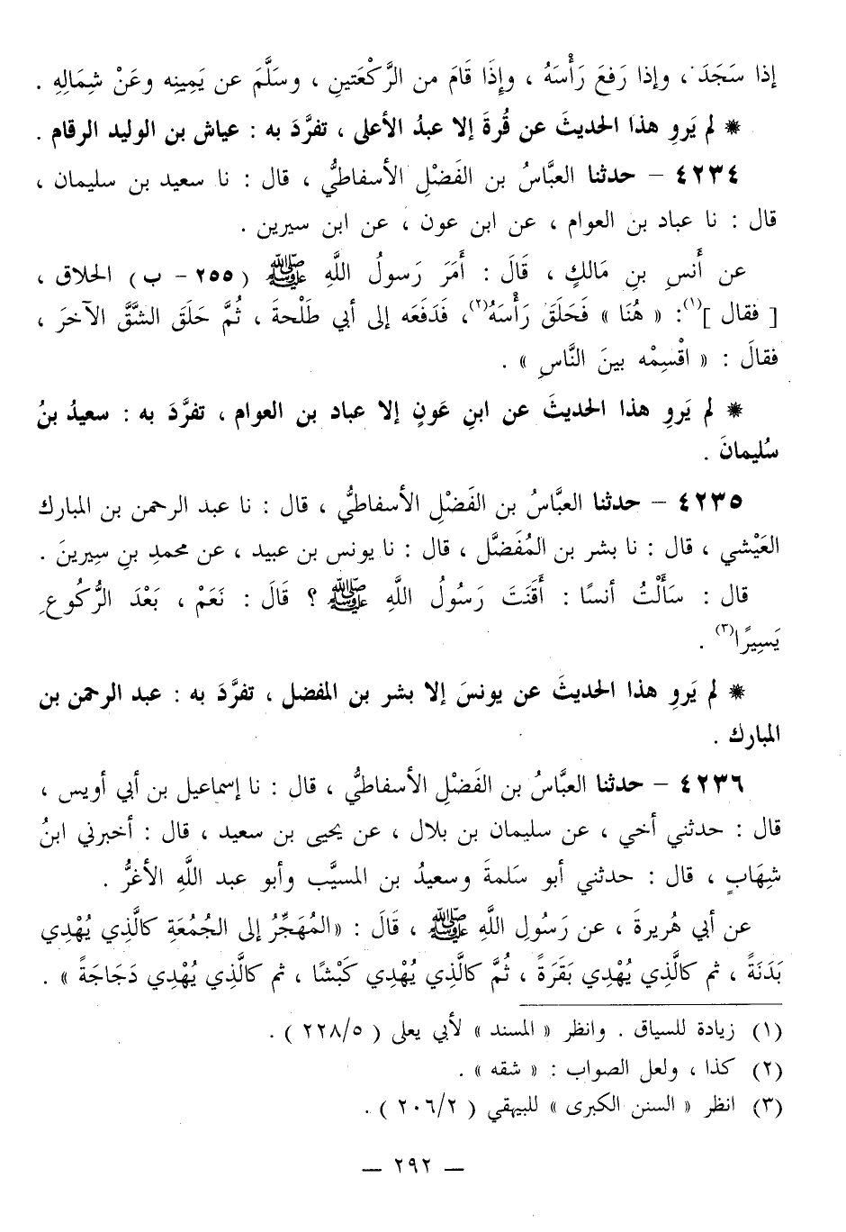 4234 - حَدَّثَنَا الْعَبَّاسُ بْنُ الْفَضْلِ الْأَسْفَاطِيُّ قَالَ: نا سَعِيدُ بْنُ سُلَيْمَانَ قَالَ: نا عَبَّادُ بْنُ الْعَوَّامِ، عَنِ ابْنِ عَوْنٍ، عَنِ ابْنِ سِيرِينَ، عَنْ أَنَسِ بْنِ مَالِكٍ قَالَ: §أَمَرَ رَسُولُ اللَّهِ صَلَّى اللهُ عَلَيْهِ وَسَلَّمَ الْحَلَّاقَ، فَقَالَ: «هُنَا» فَحَلَقَ رَأْسَهُ، فَدَفَعَهُ إِلَى أَبِي طَلْحَةَ، ثُمَّ حَلَقَ الشِّقَّ الْآخَرَ، فَقَالَ: «اقْسِمْهُ بَيْنَ النَّاسِ»
