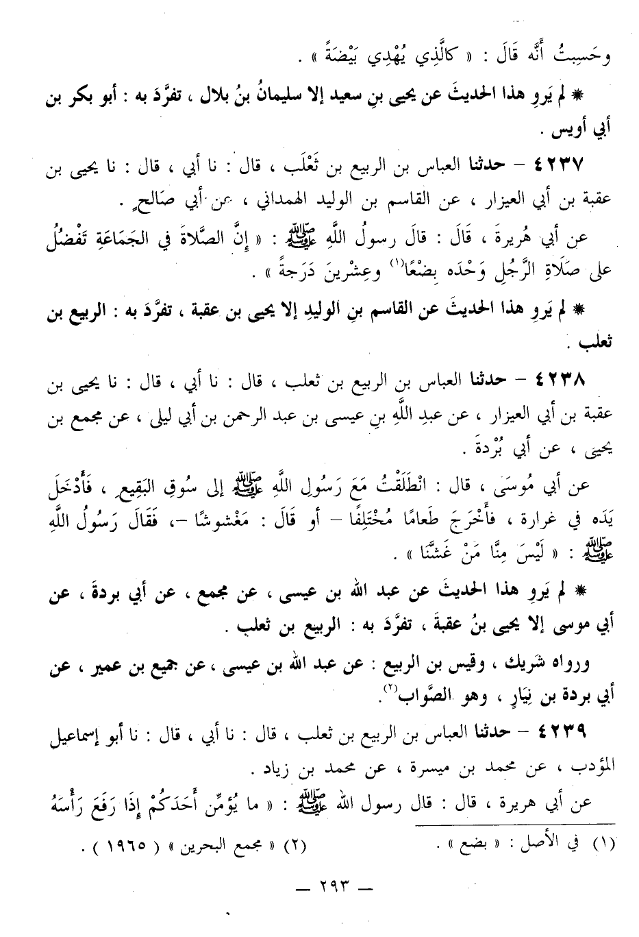4237 - حَدَّثَنَا الْعَبَّاسُ بْنُ الرَّبِيعِ بْنِ ثَعْلَبٍ قَالَ: نا أَبِي قَالَ: نا يَحْيَى بْنُ عُقْبَةَ بْنِ أَبِي الْعَيْزَارِ، عَنِ الْقَاسِمِ بْنِ الْوَلِيدِ الْهَمْدَانِيِّ، عَنْ أَبِي صَالِحٍ، عَنْ أَبِي هُرَيْرَةَ قَالَ: قَالَ رَسُولُ اللَّهِ صَلَّى اللهُ عَلَيْهِ وَسَلَّمَ: «إِنَّ §الصَّلَاةَ فِي الْجَمَاعَةِ تَفْضُلُ عَلَى صَلَاةِ الرَّجُلِ وَحْدَهُ بِضْعًا وَعِشْرِينَ دَرَجَةً»