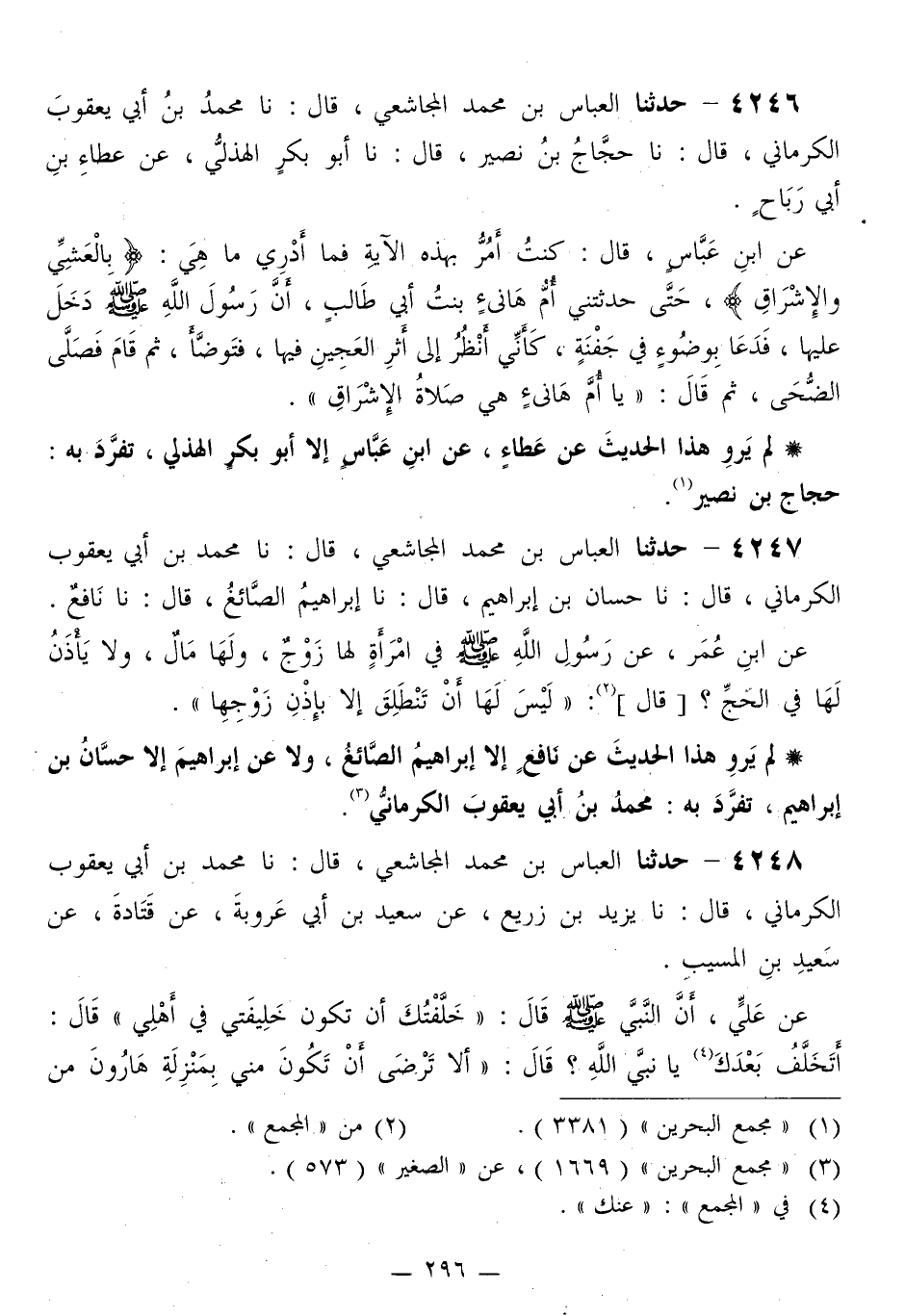 4246 - حَدَّثَنَا الْعَبَّاسُ بْنُ مُحَمَّدٍ الْمُجَاشِعِيُّ قَالَ: نا مُحَمَّدُ بْنُ أَبِي يَعْقُوبَ الْكِرْمَانِيُّ قَالَ: نا حَجَّاجُ بْنُ نُصَيْرٍ قَالَ: نا أَبُو بَكْرٍ الْهُذَلِيُّ، عَنْ عَطَاءِ بْنِ أَبِي رَبَاحٍ، عَنِ ابْنِ عَبَّاسٍ قَالَ: كُنْتُ أَمُرُّ بِهَذِهِ الْآيَةِ فَمَا أَدْرِي مَا هِيَ: {بِالْعَشِيِّ وَالْإِشْرَاقِ} [ص: 18] حَتَّى حَدَّثَتْنِي أُمُّ هَانِئٍ بِنْتُ أَبِي طَالِبٍ، أَنَّ رَسُولَ اللَّهِ صَلَّى اللهُ عَلَيْهِ وَسَلَّمَ دَخَلَ عَلَيْهَا، فَدَعَا بِوَضُوءٍ فِي جَفْنَةٍ، كَأَنِّي أَنْظُرُ إِلَى أَثَرِ الْعَجِينِ فِيهَا، §فَتَوَضَّأَ، ثُمَّ قَامَ فَصَلَّى الضُّحَى، ثُمَّ قَالَ: «يَا أُمَّ هَانِئٍ هِيَ صَلَاةُ الْإِشْرَاقِ»