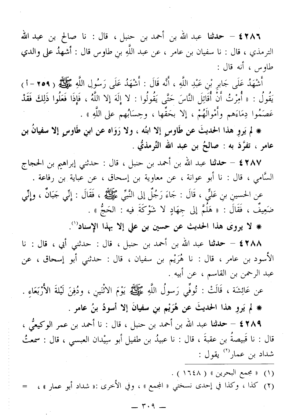 4286 - حَدَّثَنَا عَبْدُ اللَّهِ بْنُ أَحْمَدَ بْنِ حَنْبَلٍ قَالَ: نا صَالِحُ بْنُ عَبْدِ اللَّهِ التِّرْمِذِيُّ قَالَ: نا سُفْيَانُ بْنُ عَامِرٍ، عَنْ عَبْدِ اللَّهِ بْنِ طَاوُسٍ قَالَ: أَشْهَدُ عَلَى وَالِدِي طَاوُسٍ، أَنَّهُ قَالَ: أَشْهَدُ عَلَى جَابِرِ بْنِ عَبْدِ اللَّهِ، أَنَّهُ قَالَ: أَشْهَدُ عَلَى رَسُولِ اللَّهِ صَلَّى اللهُ عَلَيْهِ وَسَلَّمَ يَقُولُ: «§أُمِرْتُ أَنْ أُقَاتِلَ النَّاسَ حَتَّى يَقُولُوا: لَا إِلَهَ إِلَّا اللَّهُ فَإِذَا فَعَلُوا ذَلِكَ فَقَدْ عَصَمُوا دِمَاءَهُمْ وَأَمْوَالَهُمْ، إِلَّا بِحَقِّهَا، وَحِسَابُهُمْ عَلَى اللَّهِ»