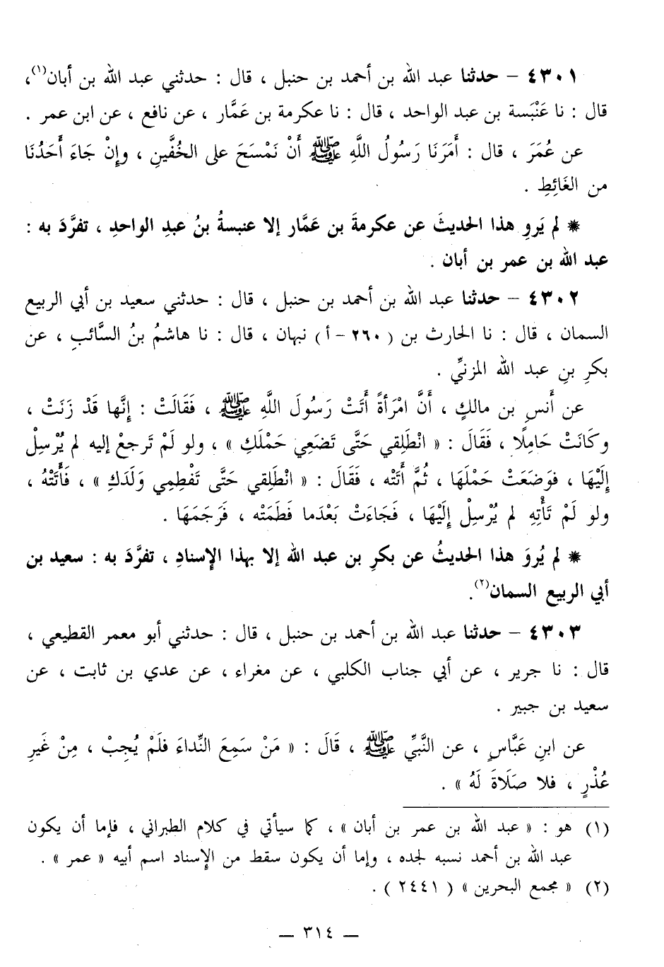 4303 - حَدَّثَنَا عَبْدُ اللَّهِ بْنُ أَحْمَدَ بْنِ حَنْبَلٍ قَالَ: حَدَّثَنِي أَبُو مَعْمَرٍ الْقَطِيعِيُّ قَالَ: نا جَرِيرٌ، عَنْ أَبِي جَنَابٍ الْكَلْبِيُّ، عَنْ مَغْرَاءَ، عَنْ عَدِيِّ بْنِ ثَابِتٍ، عَنْ سَعِيدِ بْنِ جُبَيْرٍ، عَنِ ابْنِ عَبَّاسٍ، عَنِ النَّبِيِّ صَلَّى اللهُ عَلَيْهِ وَسَلَّمَ قَالَ: «§مَنْ سَمِعَ النِّدَاءَ فَلَمْ يُجِبٍ مِنْ غَيْرِ عُذْرٍ، فَلَا صَلَاةَ لَهُ» -[315]- لَمْ يَرْوِ هَذَا الْحَدِيثَ عَنْ مَغْرَاءَ إِلَّا أَبُو جَنَابٍ وَلَا رَوَاهُ عَنْ أَبِي جَنَابٍ إِلَّا جَرِيرُ تَفَرَّدَ بِهِ أَبُو مَعْمَرٍ