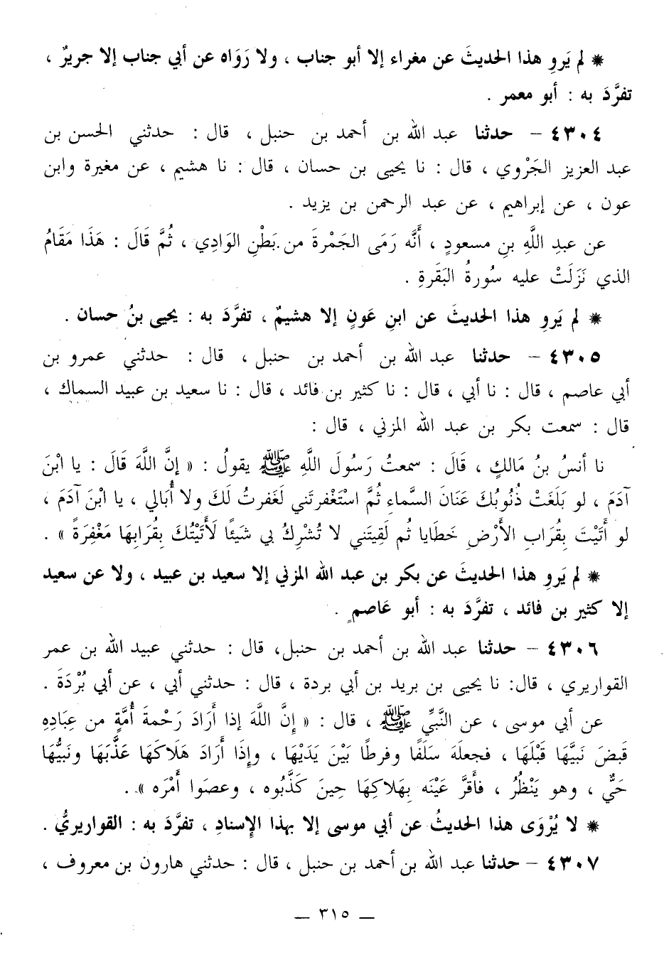 4305 - حَدَّثَنَا عَبْدُ اللَّهِ بْنُ أَحْمَدَ بْنِ حَنْبَلٍ قَالَ: حَدَّثَنِي عَمْرُو بْنُ أَبِي عَاصِمٍ قَالَ: نا أَبِي قَالَ: نا كَثِيرُ بْنُ فَائِدٍ قَالَ: نا سَعِيدُ بْنُ عُبَيْدٍ السَّمَّاكُ قَالَ: سَمِعْتُ بَكْرَ بْنَ عَبْدِ اللَّهِ الْمُزَنِيَّ قَالَ: نا أَنَسُ بْنُ مَالِكٍ قَالَ: سَمِعْتُ رَسُولَ اللَّهِ صَلَّى اللهُ عَلَيْهِ وَسَلَّمَ يَقُولُ: «إِنَّ اللَّهَ قَالَ: §يَا ابْنَ آدَمَ، لَوْ بَلَغَتْ ذُنُوبُكَ عَنَانَ السَّمَاءِ ثُمَّ اسْتَغْفَرْتَنِي لَغَفَرْتُ لَكَ وَلَا أُبَالِي، يَا ابْنَ آدَمَ، لَوْ أَتَيْتَ بِقُرَابِ الْأَرْضِ خَطَايَا ثُمَّ لَقِيتَنِي لَا تُشْرِكُ بِي شَيْئًا لَأَتَيْتُكَ بِقُرَابِهَا مَغْفِرَةً»