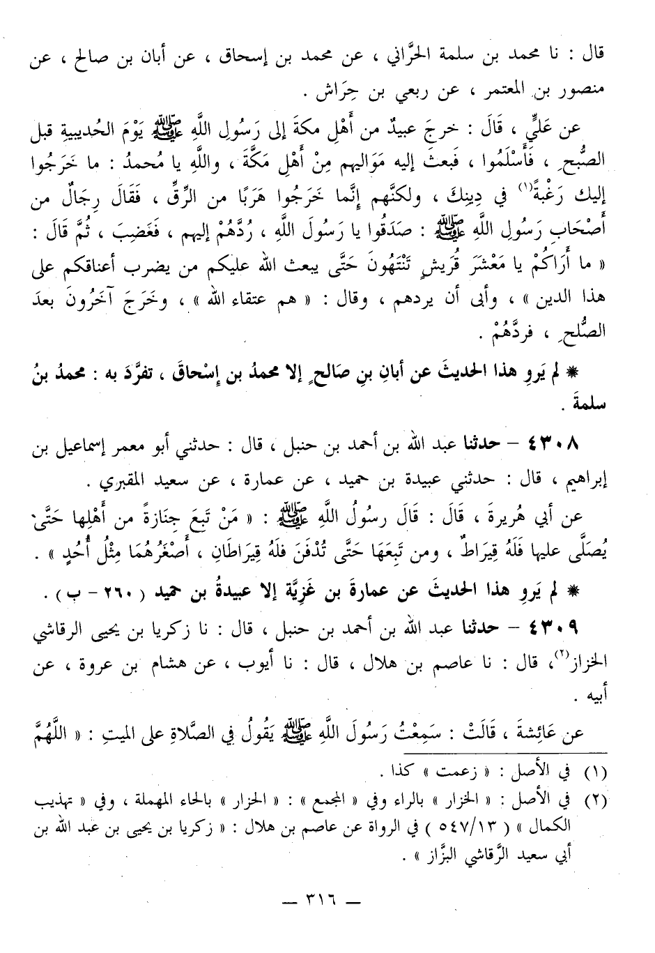 4309 - حَدَّثَنَا عَبْدُ اللَّهِ بْنُ أَحْمَدَ بْنِ حَنْبَلٍ قَالَ: نا زَكَرِيَّا بْنُ يَحْيَى الرَّقَاشِيُّ الْخَزَّازُ قَالَ: نا عَاصِمُ بْنُ هِلَالٍ قَالَ: نا أَيُّوبُ، عَنْ هِشَامِ بْنِ عُرْوَةَ، عَنْ أَبِيهِ، عَنْ عَائِشَةَ قَالَتْ: سَمِعْتُ رَسُولَ اللَّهِ صَلَّى اللهُ عَلَيْهِ وَسَلَّمَ §يَقُولُ فِي الصَّلَاةِ عَلَى الْمَيِّتِ: «اللَّهُمَّ -[317]- اغْفِرْ لَهُ، وصَلِّ عَلَيْهِ، وَبَارِكْ فِيهِ، وَأَوْرِدْهُ حَوْضَ رَسُولِكَ»