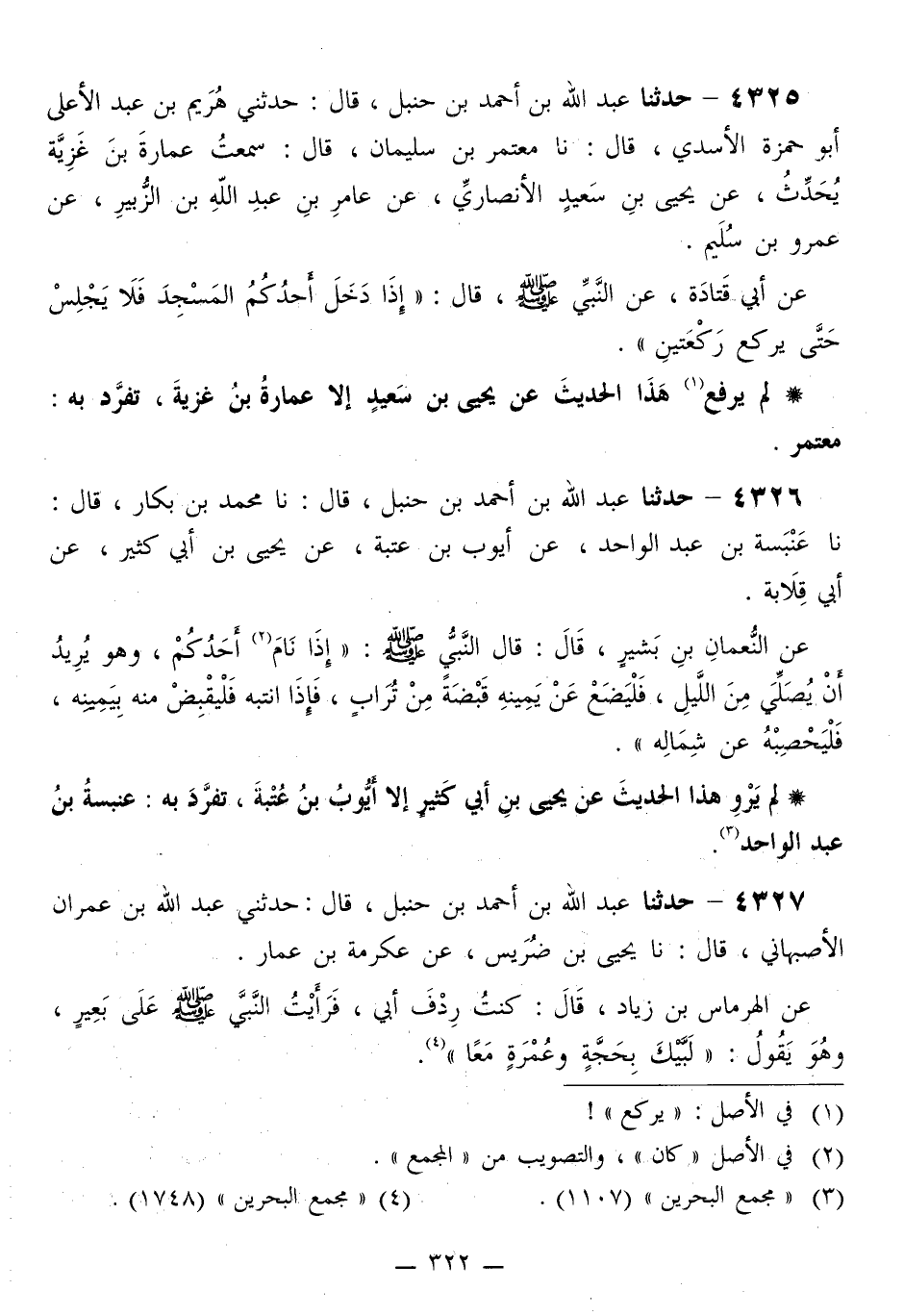 4325 - حَدَّثَنَا عَبْدُ اللَّهِ بْنُ أَحْمَدَ بْنِ حَنْبَلٍ قَالَ: حَدَّثَنِي هُرَيْمُ بْنُ عَبْدِ الْأَعْلَى أَبُو حَمْزَةَ الْأَسَدِيُّ قَالَ: نا مُعْتَمِرُ بْنُ سُلَيْمَانَ قَالَ: سَمِعْتُ عُمَارَةَ بْنَ غَزِيَّةَ، يُحَدِّثُ، عَنْ يَحْيَى بْنِ سَعِيدٍ الْأَنْصَارِيُّ، عَنْ عَامِرِ بْنِ عَبْدِ اللَّهِ بْنِ الزُّبَيْرِ، عَنْ عَمْرِو بْنِ سُلَيْمٍ، عَنْ أَبِي قَتَادَةَ، عَنِ النَّبِيِّ صَلَّى اللهُ عَلَيْهِ وَسَلَّمَ قَالَ: «§إِذَا دَخَلَ أَحَدُكُمُ الْمَسْجِدَ فَلَا يَجْلِسْ حَتَّى يَرْكَعَ رَكْعَتَيْنِ» لَمْ يَرْفَعْ هَذَا الْحَدِيثَ عَنْ يَحْيَى بْنِ سَعِيدٍ إِلَّا عُمَارَةُ بْنُ غَزِيَّةَ، تَفَرَّدَ بِهِ: مُعْتَمِرٌ "