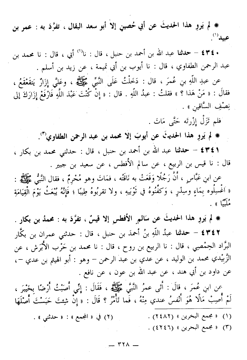 4340 - حَدَّثَنَا عَبْدُ اللَّهِ بْنُ أَحْمَدَ بْنِ حَنْبَلٍ قَالَ: نا أَبِي قَالَ: نا مُحَمَّدُ بْنُ عَبْدِ الرَّحْمَنِ الطُّفَاوِيُّ قَالَ: نا أَيُّوبَ بْنُ أَبِي تَمِيمَةَ، عَنْ زَيْدِ بْنِ أَسْلَمَ، عَنْ عَبْدِ اللَّهِ بْنِ عُمَرَ قَالَ: §دَخَلْتُ عَلَى النَّبِيِّ صَلَّى اللهُ عَلَيْهِ وَسَلَّمَ، وَعَلَيَّ إِزَارٌ يَتَقَعْقَعُ، فَقَالَ: «مَنْ هَذَا؟» فَقُلْتُ عَبْدُ اللَّهِ قَالَ: «إِنْ كُنْتَ عَبْدَ اللَّهِ فَارْفَعْ إِزَارَكَ إِلَى نِصْفِ السَّاقَيْنِ» فَلَمْ تَزَلْ إِزْرَتَهُ حَتَّى مَاتَ «