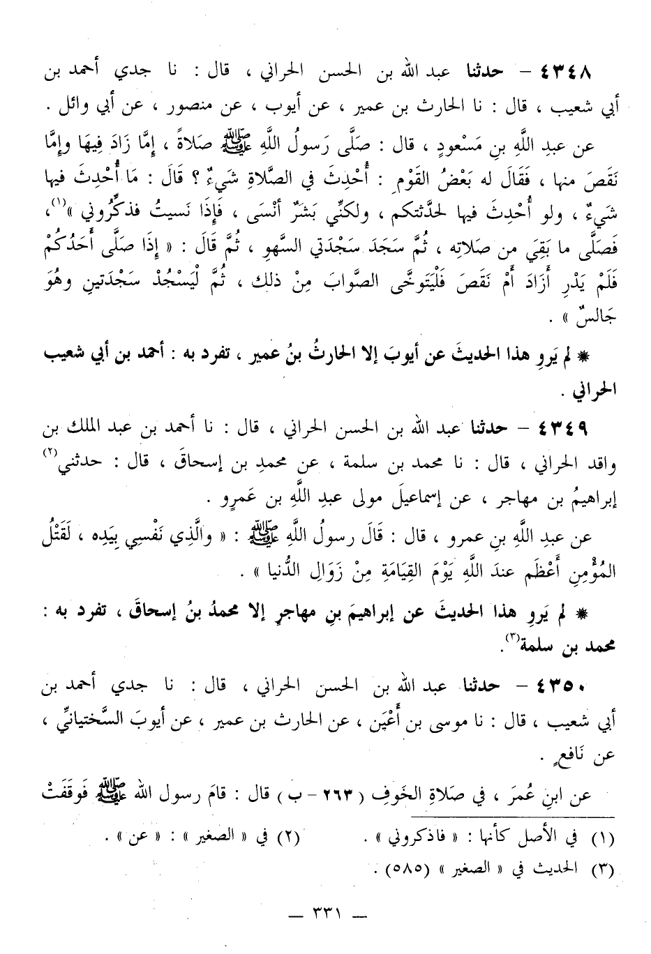 4348 - حَدَّثَنَا عَبْدُ اللَّهِ بْنُ الْحَسَنِ الْحَرَّانِيُّ قَالَ: نا جَدِّي أَحْمَدُ بْنُ أَبِي شُعَيْبٍ قَالَ: نا الْحَارِثُ بْنُ عُمَيْرٍ، عَنْ أَيُّوبَ، عَنْ مَنْصُورٍ، عَنْ أَبِي وَائِلٍ، عَنْ عَبْدِ اللَّهِ بْنِ مَسْعُودٍ قَالَ: صَلَّى رَسُولُ اللَّهِ صَلَّى اللهُ عَلَيْهِ وَسَلَّمَ صَلَاةً، إِمَّا زَادَ فِيهَا وَإِمَّا نَقَصَ مِنْهَا، فَقَالَ لَهُ بَعْضُ الْقَوْمِ: أَحَدَثَ فِي الصَّلَاةِ شَيْءٌ قَالَ: «مَا أُحْدِثَ فِيهَا شَيْءٌ وَلَوْ أُحْدِثَ فِيهَا لَحَدَّثْتُكُمْ، وَلَكِنِّي بَشَرٌ أَنْسَى، فَإِذَا نَسِيتُ فَذَكِّرُونِي» ، فَصَلَّى مَا بَقِيَ مِنْ صَلَاتِهِ، ثُمَّ سَجَدَ سَجْدَتَيِ السَّهْوِ، ثُمَّ قَالَ: «§إِذَا صَلَّى أَحَدُكُمْ فَلَمْ يَدْرِ أَزَادَ أَمْ نَقَصَ فَلْيَتَوَخَّى الصَّوَابَ مِنْ ذَلِكَ، ثُمَّ لِيَسْجُدْ سَجْدَتَيْنِ وَهُوَ جَالِسٌ»