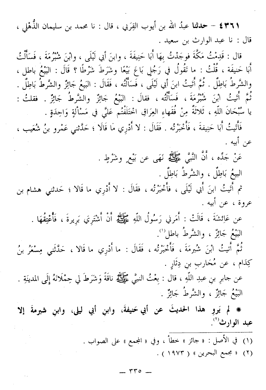 4361 - حَدَّثَنَا عَبْدُ اللَّهِ بْنُ أَيُّوبَ الْقِرَبِيُّ قَالَ: نا مُحَمَّدُ بْنُ سُلَيْمَانَ الذُّهْلِيُّ قَالَ: نا عَبْدُ الْوَارِثِ بْنُ سَعِيدٍ قَالَ: قَدِمْتُ مَكَّةَ فَوَجَدْتُ بِهَا أَبَا حَنِيفَةَ، وَابْنَ أَبِي لَيْلَى، وَابْنَ شُبْرُمَةَ، فَسَأَلْتُ أَبَا حَنِيفَةَ، قُلْتُ: §مَا تَقُولُ فِي رَجُلٍ بَاعَ بَيْعًا وَشَرَطَ شَرْطًا؟ قَالَ: «الْبَيْعُ بَاطِلٌ، وَالشَّرْطُ بَاطِلٌ» ، ثُمَّ أَتَيْتُ ابْنَ أَبِي لَيْلَى، فَسَأَلْتُهُ، فَقَالَ: «الْبَيْعُ جَائِزٌ، وَالشَّرْطُ بَاطِلٌ» ، ثُمَّ أَتَيْتُ ابْنَ شُبْرُمَةَ، فَسَأَلْتُهُ، فَقَالَ: «الْبَيْعُ جَائِزٌ، وَالشَّرْطُ جَائِزٌ» فَقُلْتُ: يَا سُبْحَانَ اللَّهِ، ثَلَاثَةٌ مِنْ فُقَهَاءِ الْعِرَاقِ اخْتَلَفْتُمْ عَلَيَّ فِي مَسْأَلَةٍ وَاحِدَةٍ. فَأَتَيْتُ أَبَا حَنِيفَةَ، فَأَخْبَرْتُهُ فَقَالَ: لَا أَدْرِي مَا قَالَا