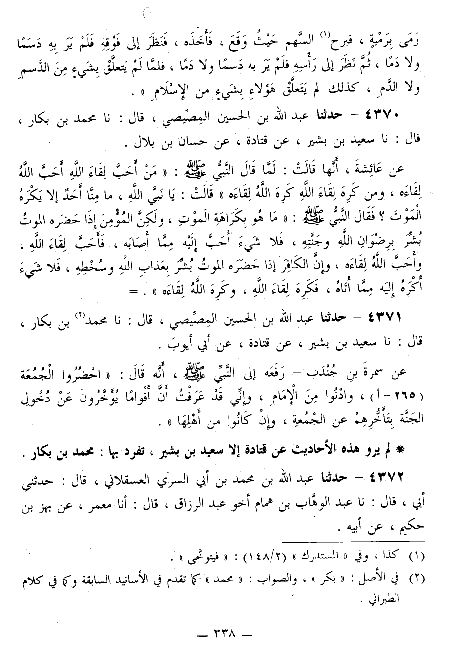 4370 - حَدَّثَنَا عَبْدُ اللَّهِ بْنُ الْحُسَيْنِ الْمِصِّيصِيُّ قَالَ: نا مُحَمَّدُ بْنُ بَكَّارٍ قَالَ: نا سَعِيدُ بْنُ بَشِيرٍ، عَنْ قَتَادَةَ، عَنْ حَسَّانَ بْنِ بِلَالٍ، عَنْ عَائِشَةَ، أَنَّهَا قَالَتْ: لَمَّا قَالَ النَّبِيُّ صَلَّى اللهُ عَلَيْهِ وَسَلَّمَ: «§مَنْ أَحَبَّ لِقَاءَ اللَّهِ أَحَبَّ اللَّهُ لِقَاءَهُ، وَمَنْ كَرِهَ لِقَاءَ اللَّهِ كَرِهَ اللَّهُ لِقَاءَهُ» قَالَتْ: يَا نَبِيَّ اللَّهِ، مَا مِنَّا أَحَدٌ إِلَّا يَكْرَهُ الْمَوْتَ؟ فَقَالَ النَّبِيُّ صَلَّى اللهُ عَلَيْهِ وَسَلَّمَ: «مَا هُوَ بِكَرَاهَةِ الْمَوْتِ، وَلَكِنَّ الْمُؤْمِنَ إِذَا حَضَرَهُ الْمَوْتُ بُشِّرَ بِرِضْوَانِ اللَّهِ وَجَنَّتِهِ، فَلَا شَيْءَ أَحَبُّ إِلَيْهِ مِمَّا أَصَابَهُ، فَأَحَبَّ لِقَاءَ اللَّهِ، وَأَحَبَّ اللَّهُ لِقَاءَهُ، وَإِنَّ الْكَافِرَ إِذَا حَضَرَهُ الْمَوْتُ بُشِّرَ بِعَذَابِ اللَّهِ وَسَخَطِهِ، فَلَا شَيْءَ أَكْرَهُ إِلَيْهِ مِمَّا أَتَاهُ، فَكَرِهَ لِقَاءَ اللَّهِ، وَكَرِهَ اللَّهُ لِقَاءَهُ»