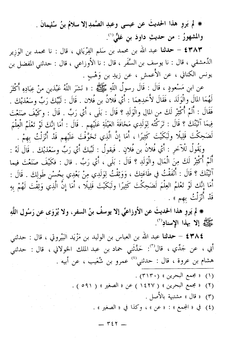 4383 - حَدَّثَنَا عَبْدُ اللَّهِ بْنُ مُحَمَّدِ بْنِ سَلْمٍ الْفِرْيَابِيُّ قَالَ: نا مُحَمَّدُ بْنُ الْوَزِيرِ الدِّمَشْقِيُّ قَالَ: نا يُوسُفُ بْنُ السَّفَرِ قَالَ: نا الْأَوْزَاعِيُّ قَالَ: حَدَّثَنِي الْمُفَضَّلُ بْنُ يُونُسَ الْكِنَانِيُّ، عَنِ الْأَعْمَشِ، عَنْ زَيْدِ بْنِ وَهْبٍ، عَنِ ابْنِ مَسْعُودٍ قَالَ: قَالَ رَسُولُ اللَّهِ صَلَّى اللهُ عَلَيْهِ وَسَلَّمَ: «نَشَرَ اللَّهُ عَبْدَيْنِ مِنْ عِبَادِهِ أَكْثَرَ لَهُمَا الْمَالَ وَالْوَلَدَ، فَقَالَ لِأَحَدِهِمَا: §أَيْ فُلَانُ بْنَ فُلَانٍ قَالَ: لَبَّيْكَ رَبِّ وَسَعْدَيْكَ فَقَالَ: أَلَمْ أُكْثِرْ لَكَ مِنَ الْمَالِ وَالْوَلَدِ؟ قَالَ: بَلَى أَيْ رَبِّ قَالَ: وَكَيْفَ صَنَعْتَ فِيمَا آتَيْتُكَ؟ قَالَ: تَرَكْتُهُ لِوَلَدِي مَخَافَةَ الْعَيْلَةِ عَلَيْهِمْ قَالَ: أَمَا إِنَّكَ لَوْ تَعَلَمُ الْعِلْمَ لَضَحِكْتَ قَلِيلًا وَلَبَكَيْتَ كَثِيرًا، أَمَا إِنَّ الَّذِي تَخَوَّفْتَ عَلَيْهِمْ قَدْ أَنْزَلْتُ بِهِمْ وَيَقُولُ لِلْآخَرِ: أَيْ فُلَانُ بْنَ فُلَانٍ فَيَقُولُ: لَبَّيْكَ أَيْ رَبِّ وَسَعْدَيْكَ قَالَ لَهُ: أَلَمْ أُكْثِرْ لَكَ مِنَ الْمَالِ وَالْوَلَدِ؟ قَالَ: بَلَى أَيْ رَبِّ قَالَ: فَكَيْفَ صَنَعْتَ فِيمَا آتَيْتُكَ؟ قَالَ: أَنْفَقْتُ فِي طَاعَتِكَ، وَوَثِقْتُ لِوَلَدِي مِنْ بَعْدِي بِحُسْنِ طَوْلِكَ قَالَ: أَمَّا إِنَّكَ لَوْ تَعَلَمُ الْعِلْمَ لَضَحِكْتَ كَثِيرًا وَلَبَكَيْتَ قَلِيلًا، أَمَا إِنَّ الَّذِي وَثِقْتَ لَهُمْ بِهِ قَدْ أَنْزَلْتُ بِهِمْ»