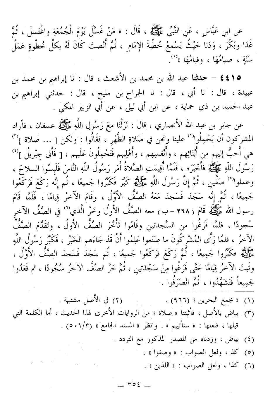 4415 - حَدَّثَنَا عَبْدُ اللَّهِ بْنُ مُحَمَّدِ بْنِ الْأَشْعَثِ قَالَ: نا إِبْرَاهِيمُ بْنُ مُحَمَّدِ بْنِ عُبَيْدَةَ قَالَ: نا أَبِي قَالَ: نا الْجَرَّاحُ بْنُ مَلِيحٍ قَالَ: حَدَّثَنِي إِبْرَاهِيمُ بْنُ عَبْدِ الْحَمِيدِ بْنِ ذِي حِمَايَةَ، عَنِ ابْنِ أَبِي لَيْلَى، عَنْ أَبِي الزُّبَيْرِ الْمَكِّيِّ، عَنْ جَابِرِ بْنِ عَبْدِ اللَّهِ الْأَنْصَارِيِّ قَالَ: نَزَلْنَا مَعَ رَسُولِ اللَّهِ صَلَّى اللهُ عَلَيْهِ وَسَلَّمَ، عُسْفَانَ، فَأَرَادَ الْمُشْرِكُونَ أَنْ يَحْمِلُوا عَلَيْنَا، وَنَحْنُ فِي صَلَاةِ الظُّهْرِ، فَقَالُوا: وَلَكِنْ §صَلَاةٌ هِيَ أَحَبُّ إِلَيْهِمْ مِنْ أَبْنَائِهِمْ، وَأَنْفُسِهِمْ وَأَهْلِيهِمْ فَتَحْمِلُونَ عَلَيْهِمْ، فَأَتَى جِبْرِيلُ رَسُولَ اللَّهِ صَلَّى اللهُ عَلَيْهِ وَسَلَّمَ فَأَخْبَرَهُ، فَلَمَّا أُقِيمَتِ الصَّلَاةُ، «أَمَرَ رَسُولُ اللَّهِ، النَّاسَ فَلَبِسُوا السِّلَاحَ وَعَمِلُوا صَفَّيْنِ، ثُمَّ إِنَّ رَسُولَ اللَّهِ صَلَّى اللهُ عَلَيْهِ وَسَلَّمَ، كَبَّرَ فَكَبَّرُوا جَمِيعًا، ثُمَّ إِنَّهُ رَكَعَ فَرَكَعُوا جَمِيعًا، ثُمَّ إِنَّهُ سَجَدَ فَسَجَدَ مَعَهُ الصَّفُّ الْأَوَّلُ، وَقَامَ الآخَرُ قِيَامًا، فَلَمَّا قَامَ رَسُولُ اللَّهِ صَلَّى اللهُ عَلَيْهِ وَسَلَّمَ قَامَ مَعَهُ الصَّفُّ الْأَوَّلُ وَخَرَّ الَّذِي فِي الصَّفِّ الْآخَرِ سُجُودًا، فَلَمَّا فَرَغُوا مِنَ السَّجْدَتَيْنِ، وَقَامُوا تَأَخَّرَ الصَّفُّ الْأَوَّلُ، وَتَقَدَّمَ الصَّفُّ الْآخَرُ، فَلَمَّا رَأَى الْمُشْرِكُونَ مَا صَنَعُوا عَلِمُوا أَنْ قَدْ جَاءَهُمُ الْخَبَرُ، فَكَبَّرَ رَسُولُ اللَّهِ صَلَّى اللهُ عَلَيْهِ وَسَلَّمَ فَكَبَّرُوا جَمِيعًا، ثُمَّ رَكَعَ فَرَكَعُوا جَمِيعًا، ثُمَّ سَجَدَ فَسَجَدَ الصَّفُّ الْأَوَّلُ، وَثَبَتَ الْآخَرُ قِيَامًا، حَتَّى فَرَغُوا مِنْ سَجْدَتَيْنِ، ثُمَّ خَرَّ الصَّفُّ الْآخَرُ سُجُودًا، ثُمَّ قَعَدُوا جَمِيعًا فَتَشَهَّدُوا، ثُمَّ انْصَرَفُوا» -[355]- لَمْ يَرْوِ هَذَا الْحَدِيثَ عَنِ ابْنِ أَبِي لَيْلَى إِلَّا ابْنُ ذِي حِمَايَةَ "