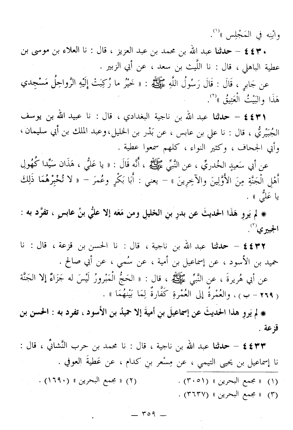 4430 - حَدَّثَنَا عَبْدُ اللَّهِ بْنُ مُحَمَّدِ بْنِ عَبْدِ الْعَزِيزِ قَالَ: نا الْعَلَاءُ بْنُ مُوسَى بْنِ عَطِيَّةَ الْبَاهِلِيُّ قَالَ: نا اللَّيْثُ بْنُ سَعْدٍ، عَنْ أَبِي الزُّبَيْرِ، عَنْ جَابِرٍ قَالَ: قَالَ رَسُولُ اللَّهِ صَلَّى اللهُ عَلَيْهِ وَسَلَّمَ: «§خَيْرُ مَا رُكِبَتْ إِلَيْهِ الرَّوَاحِلُ مَسْجِدِي هَذَا، وَالْبَيْتُ الْعَتِيقُ»