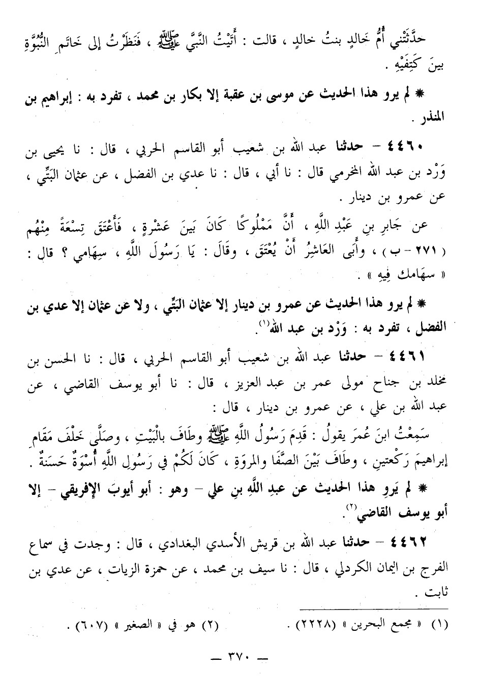 4461 - حَدَّثَنَا عَبْدُ اللَّهِ بْنُ شُعَيْبٍ أَبُو الْقَاسِمِ الْحَرْبِيُّ قَالَ: نا الْحَسَنُ بْنُ مَخْلَدِ بْنِ جَنَاحٍ، مَوْلَى عُمَرَ بْنِ عَبْدِ الْعَزِيزِ قَالَ: نا أَبُو يُوسُفَ الْقَاضِي، عَنْ عَبْدِ اللَّهِ بْنِ عَلِيٍّ، عَنْ عَمْرِو بْنِ دِينَارٍ قَالَ: سَمِعْتُ ابْنَ عُمَرَ، يَقُولُ: «قَدِمَ رَسُولُ اللَّهِ صَلَّى اللهُ عَلَيْهِ وَسَلَّمَ §وَطَافَ بِالْبَيْتِ، وَصَلَّى خَلْفَ مَقَامِ إِبْرَاهِيمَ رَكْعَتَيْنِ، وَطَافَ بَيْنَ الصَّفَا وَالْمَرْوَةِ، كَانَ لَكُمْ فِي رَسُولِ اللَّهِ أُسْوَةٌ حَسَنَةٌ»