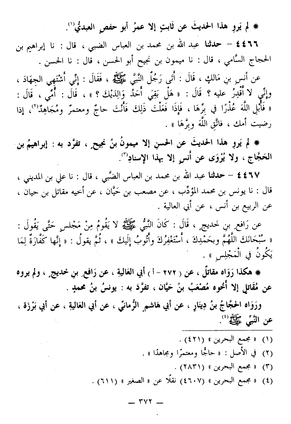 4467 - حَدَّثَنَا عَبْدُ اللَّهِ بْنُ مُحَمَّدِ بْنِ الْعَبَّاسِ الضَّبِّيُّ قَالَ: نا عَلِيُّ بْنُ الْمَدِينِيِّ قَالَ: نا يُونُسُ بْنُ مُحَمَّدٍ الْمُؤَدِّبُ، عَنْ مُصْعَبِ بْنِ حَيَّانَ، عَنْ أَخِيهِ مُقَاتِلِ بْنِ حَيَّانَ، عَنِ الرَّبِيعِ بْنِ أَنَسٍ، عَنْ أَبِي الْعَالِيَةِ، عَنْ رَافِعِ بْنِ خَدِيجٍ قَالَ: كَانَ النَّبِيُّ صَلَّى اللهُ عَلَيْهِ وَسَلَّمَ §لَا يَقُومُ مِنْ مَجْلِسٍ حَتَّى يَقُولُ: «سُبْحَانَكَ اللَّهُمَّ وَبِحَمْدِكَ، أَسْتَغْفِرُكَ وَأَتُوبُ إِلَيْكَ» ثُمَّ يَقُولُ: «إِنَّهَا كَفَّارَةٌ لِمَا يَكُونُ فِي الْمَجْلِسِ» هَكَذَا رَوَاهُ مُقَاتِلٌ، عَنْ أَبِي الْعَالِيَةِ، عَنْ رَافِعِ بْنِ خَدِيجٍ «وَلَمْ يَرْوِهِ عَنْ مُقَاتِلٍ إِلَّا أَخُوهُ مُصْعَبُ بْنُ حَيَّانَ، تَفَرَّدَ بِهِ يُونُسُ بْنُ مُحَمَّدٍ» وَرَوَاهُ الْحَجَّاجُ بْنُ دِينَارٍ، عَنْ أَبِي هَاشِمٍ الرُّمَّانِيِّ، عَنْ أَبِي الْعَالِيَةِ، عَنْ أَبِي بَرْزَةَ، عَنِ النَّبِيِّ صَلَّى اللهُ عَلَيْهِ وَسَلَّمَ