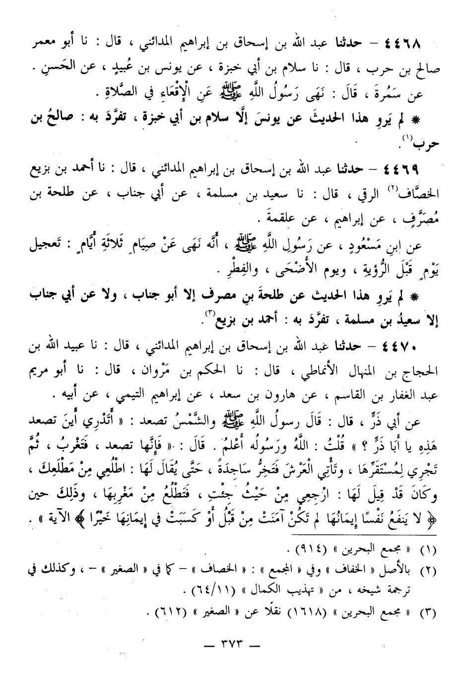 4470 - حَدَّثَنَا عَبْدُ اللَّهِ بْنُ إِسْحَاقَ بْنِ إِبْرَاهِيمَ الْمَدَائِنِيُّ قَالَ: نا عُبَيْدُ اللَّهِ بْنُ الْحَجَّاجِ بْنِ الْمِنْهَالِ الْأنْمَاطِيُّ قَالَ: نا الْحَكَمُ بْنُ مَرْوَانَ قَالَ: نا أَبُو مَرْيَمَ عَبْدُ الْغَفَّارِ بْنُ الْقَاسِمِ، عَنْ هَارُونَ بْنِ سَعْدٍ، عَنْ إِبْرَاهِيمَ التَّيْمِيِّ، عَنْ أَبِيهِ، عَنْ أَبِي ذَرٍّ قَالَ: قَالَ رَسُولُ اللَّهِ صَلَّى اللهُ عَلَيْهِ وَسَلَّمَ وَالشَّمْسُ تَصْعَدُ: «أَتَدْرِي أَيْنَ تَصْعَدُ هَذِهِ يَا أَبَا ذَرٍّ؟» قُلْتُ: اللَّهُ وَرَسُولُهُ أَعْلَمُ قَالَ: «§فَإِنَّهَا تَصْعَدُ فَتَغْرُبُ، ثُمَّ تَجْرِي لِمُسْتَقَرِّهَا، وَتَأْتِي الْعَرْشَ فَتَخِرُّ سَاجِدَةً، حَتَّى يُقَالُ لَهَا: اطْلُعِي مِنْ مَطْلَعِكِ، وَكَانَ قَدْ قِيلَ لَهَا: ارْجِعِي مِنْ حَيْثُ جِئْتِ، فَتَطْلُعُ مِنْ مَغْرِبِهَا، وَذَلِكَ حِينَ {لَا يَنْفَعُ نَفْسًا إِيمَانُهَا لَمْ تَكُنْ آمَنَتْ مِنْ قَبْلُ أَوْ كَسَبَتْ فِي إِيمَانِهَا خَيْرًا} [الأنعام: 158] » الْآيَةَ «-[374]- لَمْ يَرْوِ هَذَا الْحَدِيثَ، عَنْ هَارُونَ بْنِ سَعِيدٍ أَلَا أَبُو مَرْيَمَ، تَفَرَّدَ بِهِ: الْحَكَمُ بْنُ مَرْوَانَ»