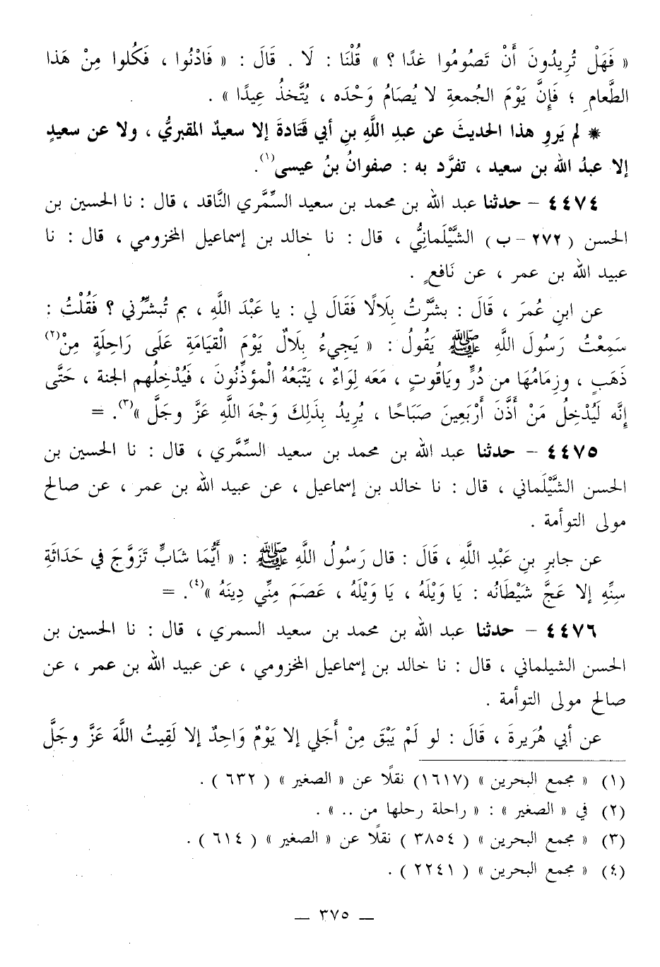 4474 - حَدَّثَنَا عَبْدُ اللَّهِ بْنُ مُحَمَّدِ بْنِ سَعِيدٍ السَّمُرِيُّ النَّاقِدُ قَالَ: نا الْحُسَيْنُ بْنُ الْحَسَنِ الشَّيْلَمَانِيُّ قَالَ: نا خَالِدُ بْنُ إِسْمَاعِيلَ الْمَخْزُومِيُّ قَالَ: نا عُبَيْدُ اللَّهِ بْنُ عُمَرَ، عَنْ نَافِعٍ، عَنِ ابْنِ عُمَرَ قَالَ: بَشَّرْتُ بِلَالًا فَقَالَ لِي: يَا عَبْدَ اللَّهِ، بِمَ تُبَشِّرُنِي؟ فَقُلْتُ: سَمِعْتُ رَسُولَ اللَّهِ صَلَّى اللهُ عَلَيْهِ وَسَلَّمَ يَقُولُ: «§يَجِيءُ بِلَالٌ يَوْمَ الْقِيَامَةِ عَلَى رَاحِلَةٍ مِنْ ذَهَبٍ وَزِمَامُهَا مِنْ دُرٍّ وَيَاقُوتٍ، مَعَهُ لِوَاءٌ يَتْبَعُهُ الْمُؤَذِّنُونَ، فَيُدْخِلَهُمُ الْجَنَّةَ، حَتَّى إِنَّهُ لَيُدْخِلُ مَنْ أَذَّنَ أَرْبَعِينَ صَبَاحًا، يُرِيدُ بِذَلِكَ وَجْهَ اللَّهِ عَزَّ وَجَلَّ»