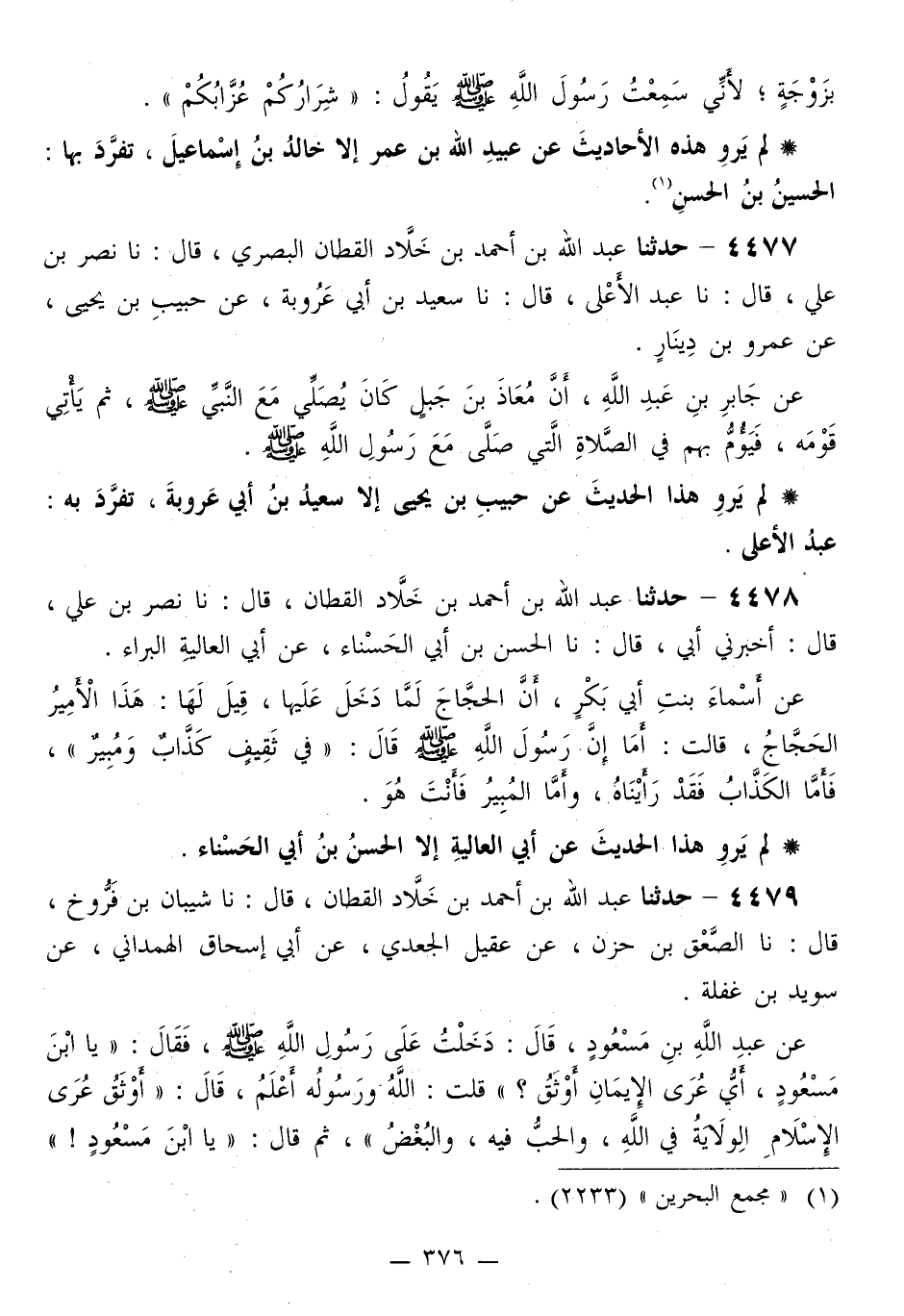 4479 - حَدَّثَنَا عَبْدُ اللَّهِ بْنُ أَحْمَدَ بْنِ خَلَّادٍ الْقَطَّانُ قَالَ: نا شَيْبَانُ بْنُ فَرُّوخٍ قَالَ: نا الصَّعْقُ بْنُ حَزْنٍ، عَنْ عُقَيْلٍ الْجَعْدِيِّ، عَنْ أَبِي إِسْحَاقَ الْهَمْدَانِيِّ، عَنْ سُوَيْدِ بْنِ غَفَلَةَ، عَنْ عَبْدِ اللَّهِ بْنِ مَسْعُودٍ قَالَ: دَخَلْتُ عَلَى رَسُولِ اللَّهِ صَلَّى اللهُ عَلَيْهِ وَسَلَّمَ فَقَالَ: «يَا ابْنَ مَسْعُودٍ، أَيُّ عُرَى الْإِيمَانِ أَوْثَقُ؟» قُلْتُ: اللَّهُ وَرَسُولُهُ أَعْلَمُ قَالَ: «§أَوْثَقُ عُرَى الْإِسْلَامِ الْوَلَايَةُ فِي اللَّهِ، وَالْحُبُّ فِيهِ، وَالْبُغْضِ»