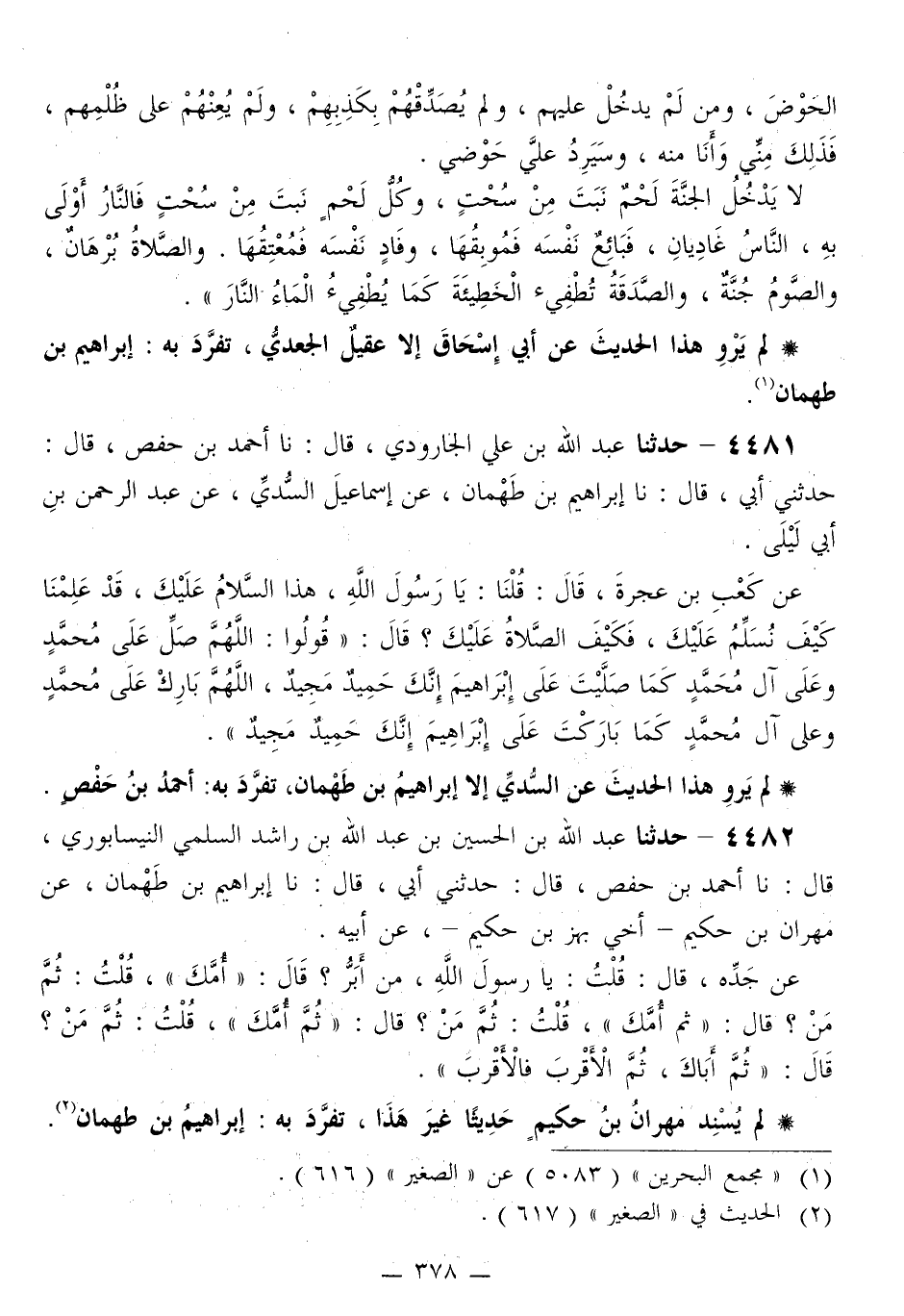 4481 - حَدَّثَنَا عَبْدُ اللَّهِ بْنُ عَلِيٍّ الْجَارُودِيُّ قَالَ: نا أَحْمَدُ بْنُ حَفْصٍ قَالَ: حَدَّثَنِي أَبِي قَالَ: نا إِبْرَاهِيمُ بْنُ طَهْمَانَ، عَنْ إِسْمَاعِيلَ السُّدِّيِّ، عَنْ عَبْدِ الرَّحْمَنِ بْنِ أَبِي لَيْلَى، عَنْ كَعْبِ بْنِ عُجْرَةَ قَالَ: قُلْنَا يَا رَسُولَ اللَّهِ، هَذَا السَّلَامُ عَلَيْكَ، قَدْ §عَلِمْنَا كَيْفَ نُسَلِّمُ عَلَيْكَ، فَكَيْفَ الصَّلَاةُ عَلَيْكَ؟ قَالَ: «قُولُوا: اللَّهُمَّ صَلِّي عَلَى مُحَمَّدٍ وَعَلَى آلِ مُحَمَّدٍ كَمَا صَلَّيْتَ عَلَى إِبْرَاهِيمَ إِنَّكَ حَمِيدٌ مَجِيدٌ، اللَّهُمَّ بَارِكْ عَلَى مُحَمَّدٍ وَعَلَى آلِ مُحَمَّدٍ كَمَا بَارَكْتَ عَلَى إِبْرَاهِيمَ إِنَّكَ حَمِيدٌ مَجِيدٌ»