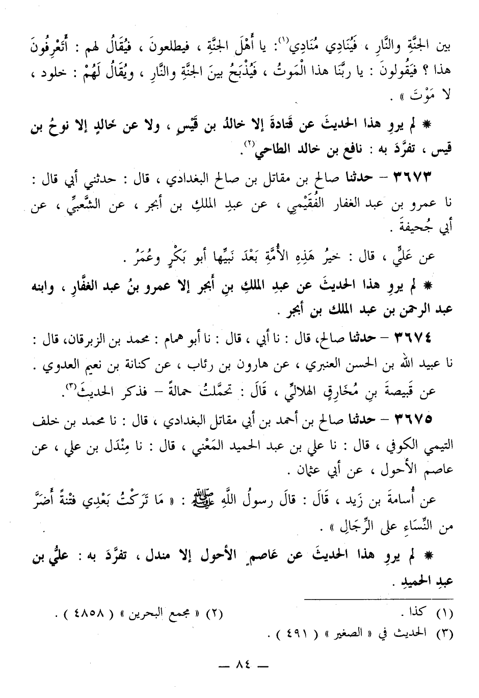 3675 - حَدَّثَنَا صَالِحُ بْنُ أَحْمَدَ بْنِ أَبِي مُقَاتِلٍ الْبَغْدَادِيُّ قَالَ: نا مُحَمَّدُ بْنُ خَلَفٍ التَّيْمِيُّ الْكُوفِيُّ قَالَ: نا عَلِيُّ بْنُ عَبْدِ الْحَمِيدِ الْمَعْنِيُّ قَالَ: نا مِنْدَلُ بْنُ عَلِيٍّ، عَنْ عَاصِمٍ الْأَحْوَلِ، عَنْ أَبِي عُثْمَانَ، عَنْ أُسَامَةَ بْنِ زَيْدٍ قَالَ: قَالَ رَسُولُ اللَّهِ صَلَّى اللهُ عَلَيْهِ وَسَلَّمَ: «§مَا تَرَكْتُ بَعْدِي فِتْنَةً أَضَرَّ مِنَ النِّسَاءِ عَلَى الرِّجَالِ»