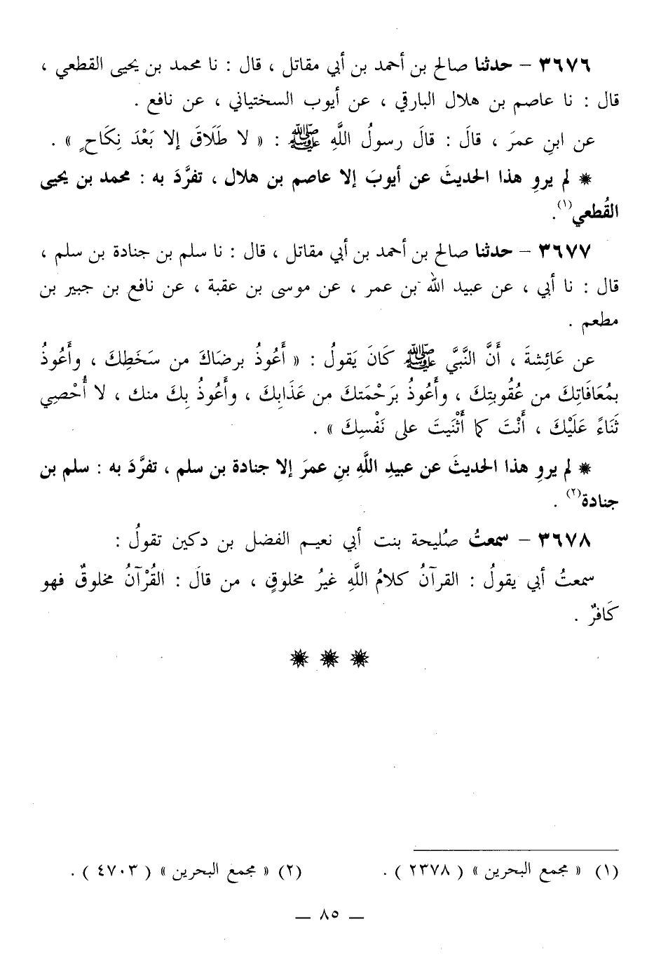 3678 - سَمِعْتُ صُلَيْحَةَ بِنْتَ أَبِي نُعَيْمٍ الْفَضْلِ بْنِ دُكَيْنٍ، تَقُولُ: سَمِعْتُ أَبِي يَقُولُ: «§الْقُرْآنُ كَلَامُ اللَّهِ غَيْرُ مَخْلُوقٍ، مَنْ قَالَ: الْقُرْآنُ مَخْلُوقٌ فَهُوَ كَافِرٌ»