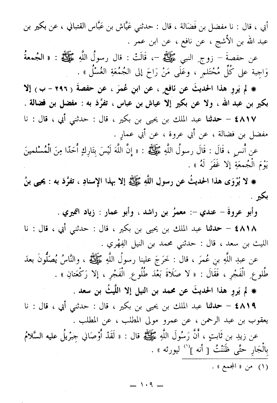 4818 - حَدَّثَنَا عَبْدُ الْمَلِكِ بْنُ يَحْيَى بْنِ بُكَيْرٍ قَالَ: حَدَّثَنِي أَبِي قَالَ: نَا اللَّيْثُ بْنُ سَعْدٍ قَالَ: حَدَّثَنِي مُحَمَّدُ بْنُ النَّيْلِ الْفِهْرِيُّ، عَنْ عَبْدِ اللَّهِ بْنِ عُمَرَ قَالَ: خَرَجَ عَلَيْنَا رَسُولُ اللَّهِ صَلَّى اللهُ عَلَيْهِ وَسَلَّمَ، وَالنَّاسُ يُصَلُّونَ بَعْدَ طُلُوعِ الْفَجْرِ، فَقَالَ: «§لَا صَلَاةَ بَعْدَ طُلُوعِ الْفَجْرِ، إِلَّا رَكْعَتَانِ»